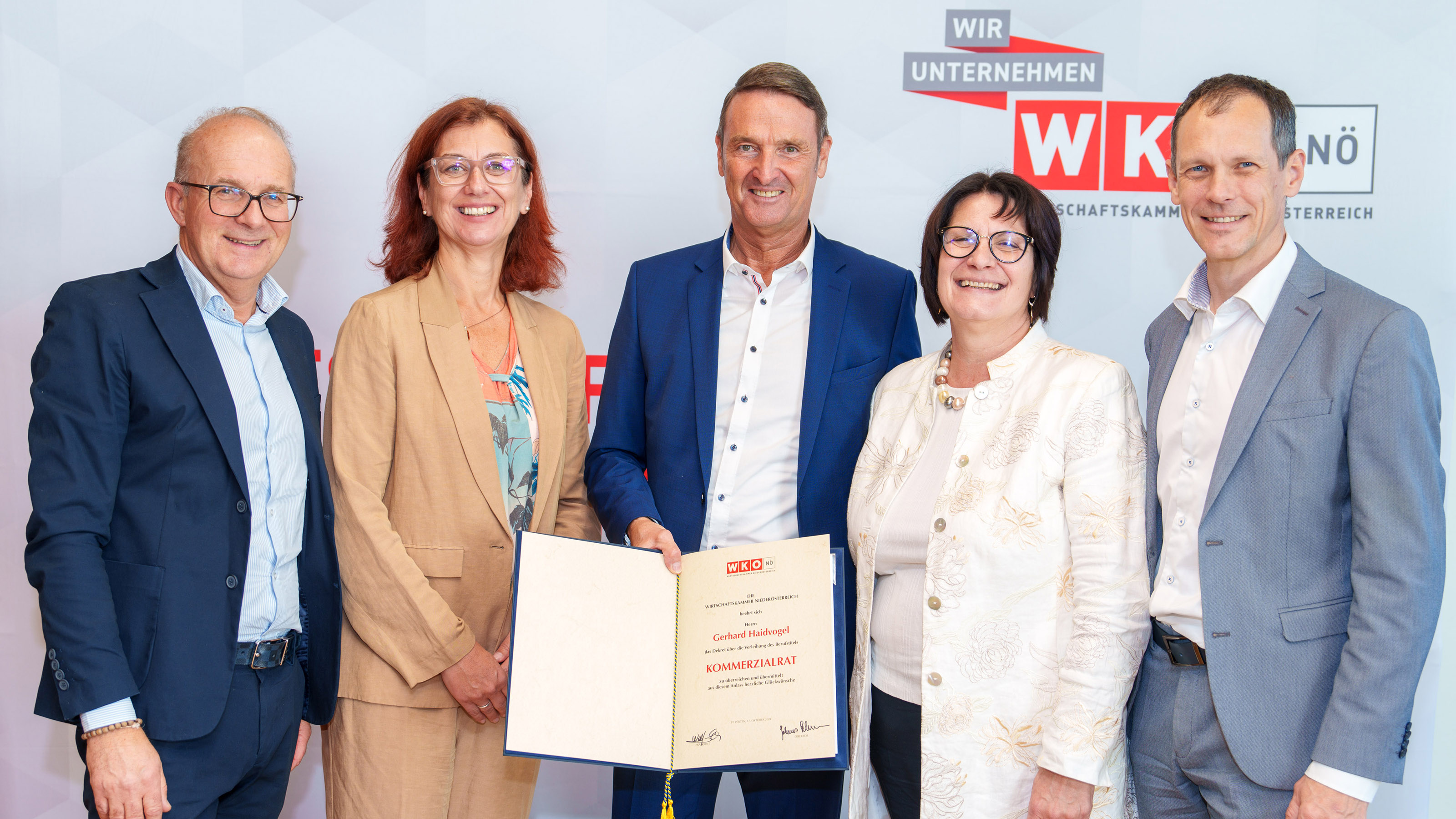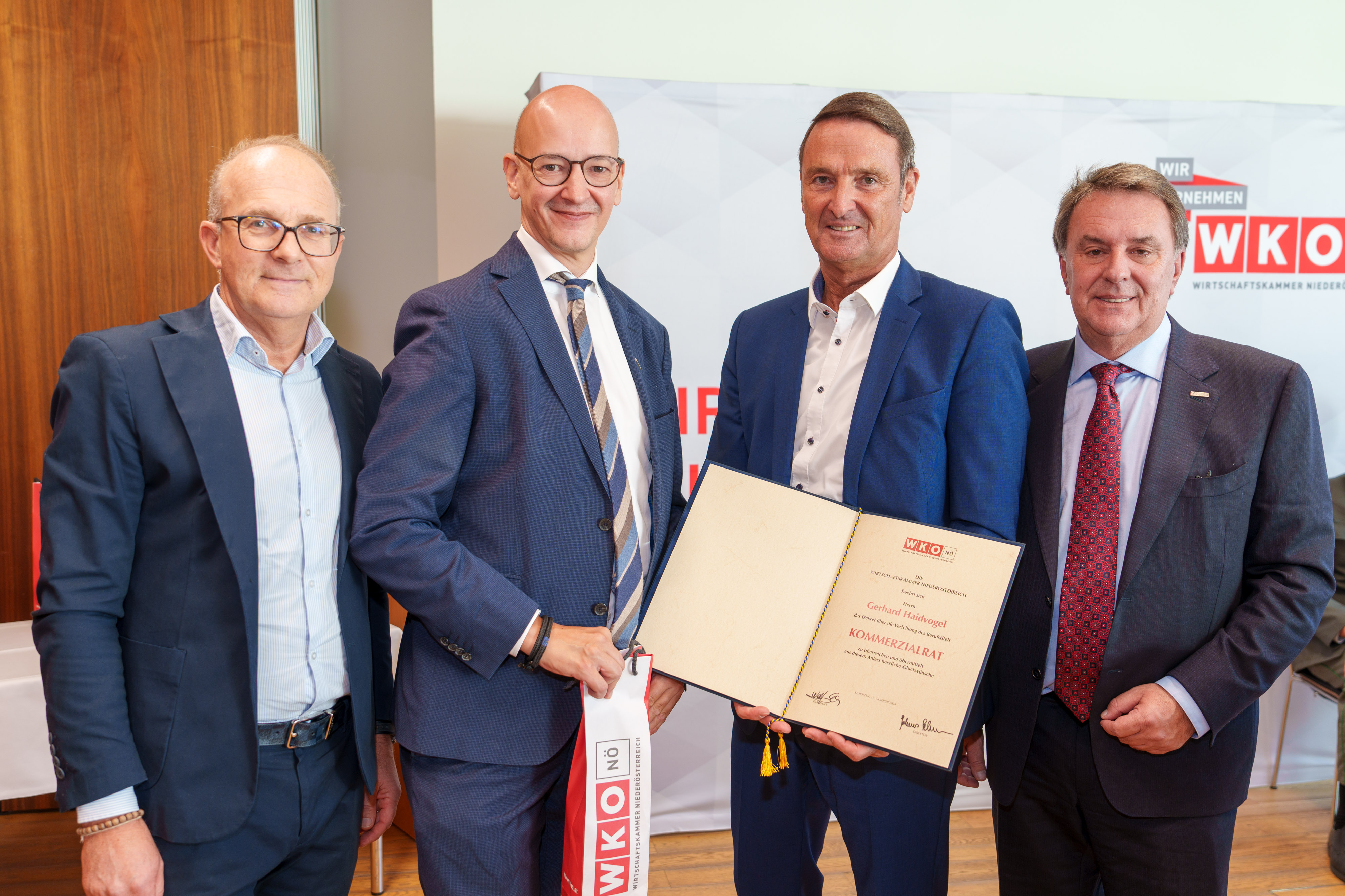 WKNÖ-Präsident Wolfgang Ecker überreichte im Rahmen eines Festaktes im Schwaighof (St. Pölten) das Dekret über die Verleihung des Berufstitels ‚Kommerzialrat‘ an Gerhard Haidvogel. Damit erfahren die Leistungen des verdienten Vertreters der Wirtschaft eine offizielle Anerkennung durch die Republik Österreich. Grundlage dafür ist die Entschließung von Bundespräsident Alexander Van der Bellen. Gerhard Haidvogel ist nun berechtigt, den Berufstitel Kommerzialrat zu führen.