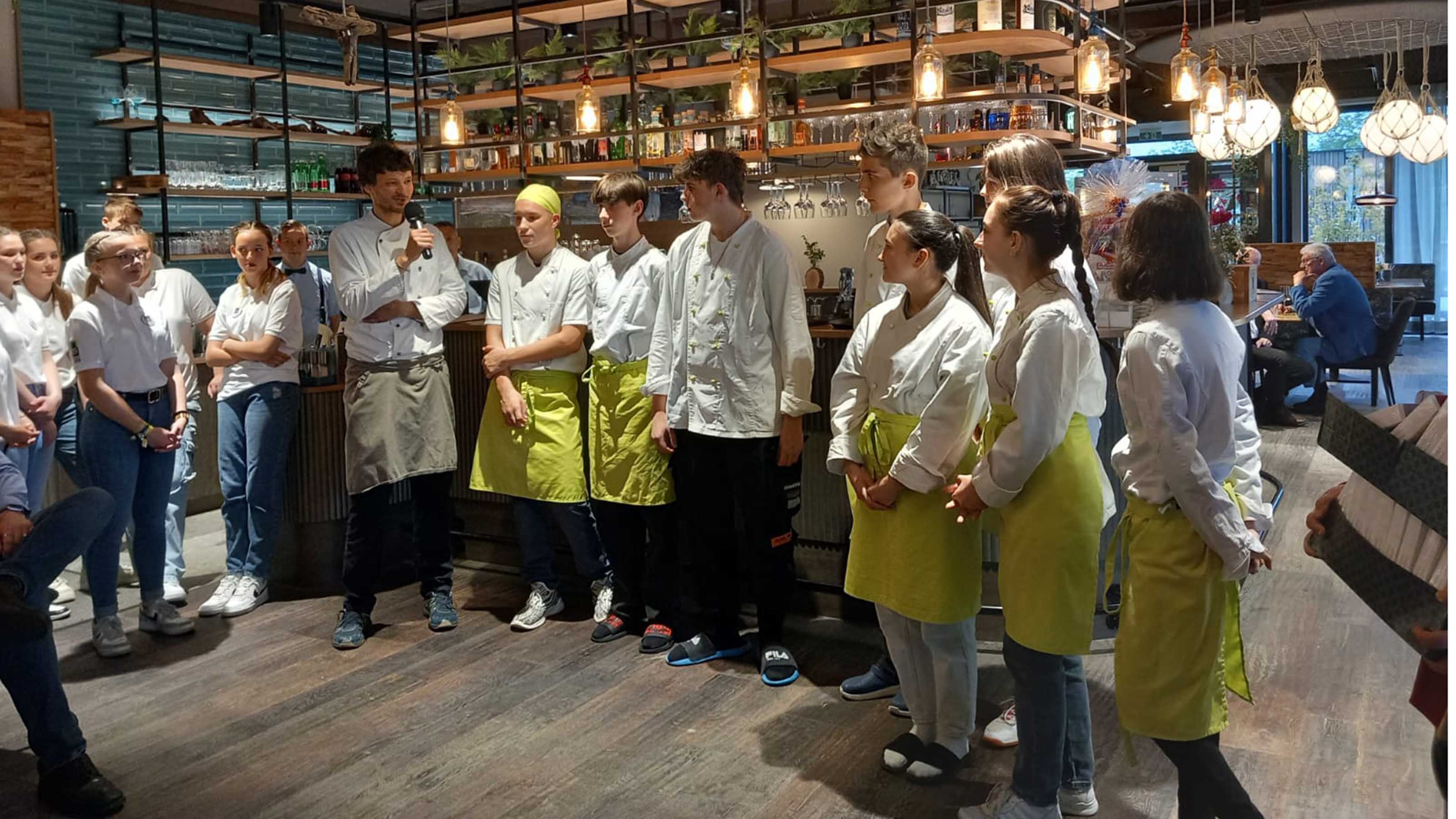 Nach Besichtigung der Schule ging es ins direkt angrenzende Lokal „Seedeck“. Inhaber und Gastronom Thomas „Jimmy“ Barta stellte dankenswerterweise nicht nur sein Restaurant für zur Verfügung, sondern überließ den SchülerInnen des aktuellen Jahrgangs auch gleich die Verantwortung in der Küche und im Service, um die Gäste mit einem Drei-Gänge-Menü kulinarisch zu verwöhnen.