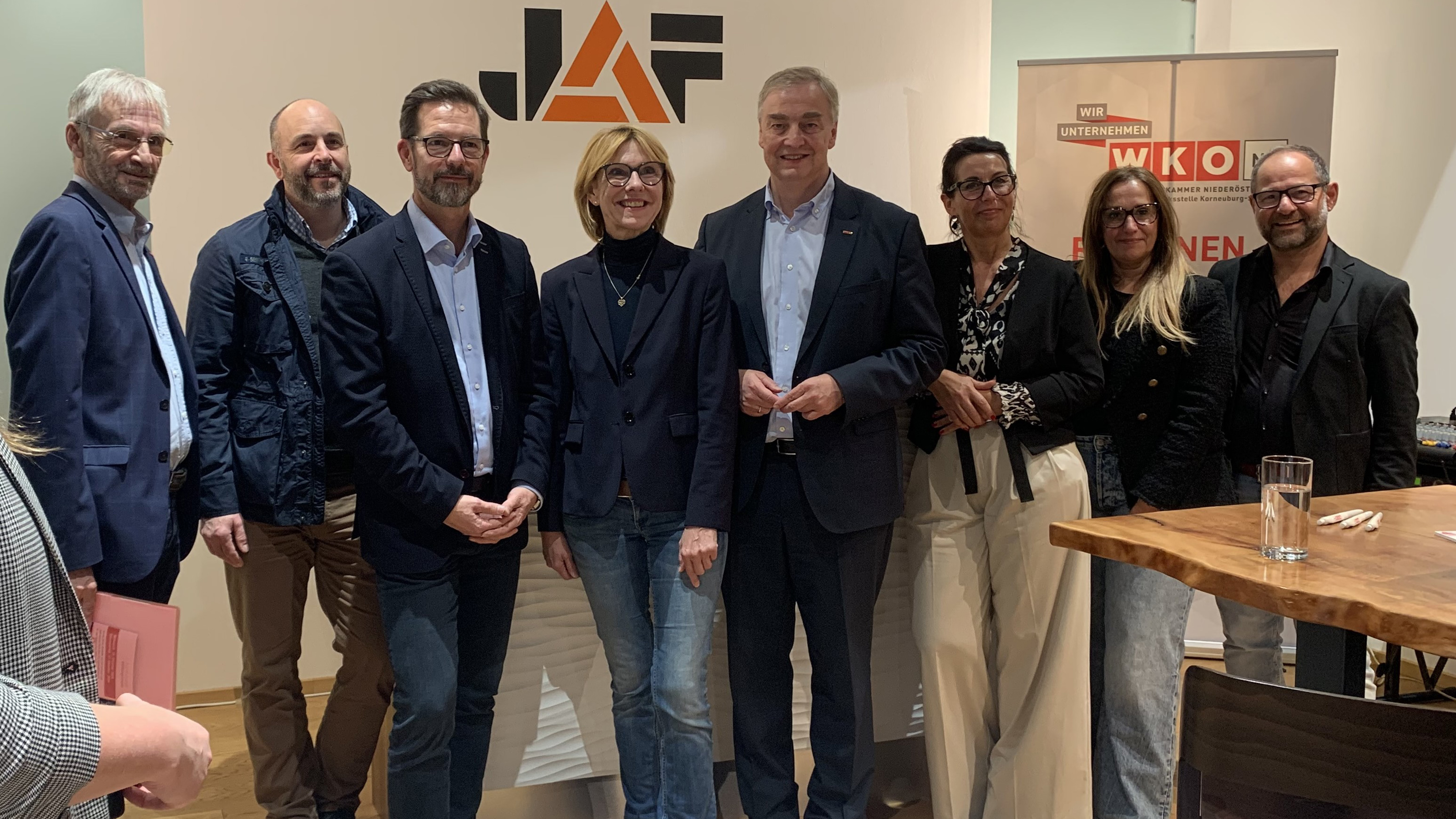 Nach einer spannenden Betriebsführung durch die großen Lagerhallen und den Schauraum von J.u.A. Frischeis, einem der führenden Holzgroßhandelsunternehmen Europas, präsentierten Niederlassungsleiter Clemens Zika und Landesgeschäftsführer von JAF Österreich David Brenner die Firmengeschichte sowie die aktuellen Entwicklungen. Das Unternehmen bildet österreichweit derzeit 16 Lehrlinge in drei Lehrberufen aus. Weltweit ist das in Stockerau gegründete Familienunternehmen mit 71 Standorten in 15 Ländern vertreten. Im Anschluss fand eine Gesprächsrunde zwischen Vertreter:Innen der Wirtschaftskammer, der Arbeiterkammer und dem AMS statt. Der hohe Stellenwert der dualen Ausbildungsform der Lehre wurde von allen Seiten betont. Es herrschte Einigkeit darüber, dass die Lehre ein Gewinn für alle ist und die Zusammenarbeit zwischen Lehrbetrieben und Lehrlingen im Bezirk sehr gut funktioniert.
