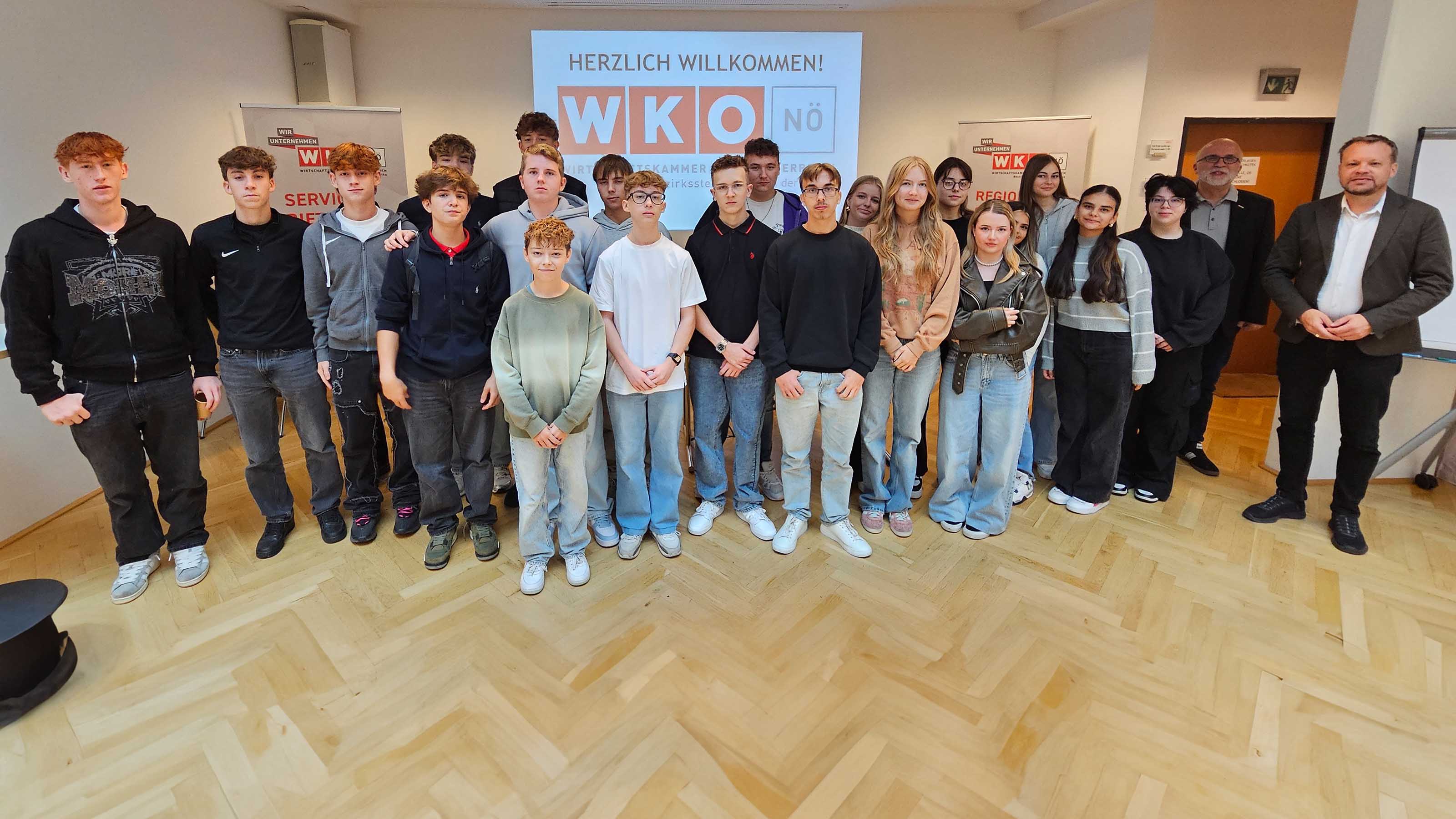 Bezirksstellenleiter Thomas Petzel informierte die Schülerinnen und Schüler über das Serviceangebot der WKNÖ, die Wirtschaftsdaten des Bezirkes und stand anschließend für weitere Fragen zur Verfügung.