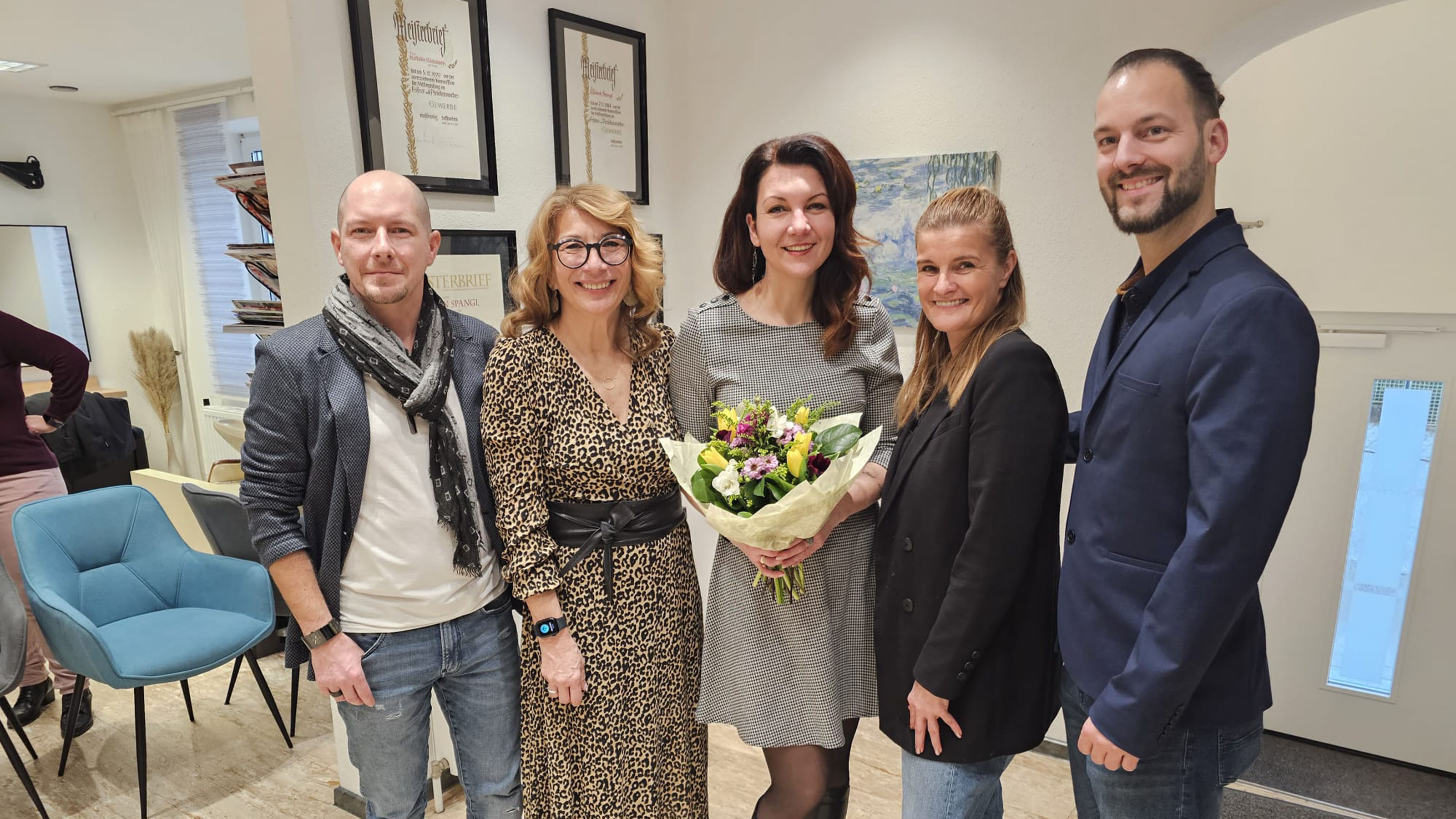 Kürzlich übernahmen Viktoria und Florian Spangl (Bildmitte und rechts) den Friseursalon von Elisabeth Spangl. Zu diesem Anlass gratulierten Landesinnungsmeister-Stv. Daniel Daurer (links), Landesinnungsmeisterin Silvia Rupp (2.v.l.) und Landeslehrlingswartin Kirstin Eßletzbichler und wünschten alles Gute für die Zukunft