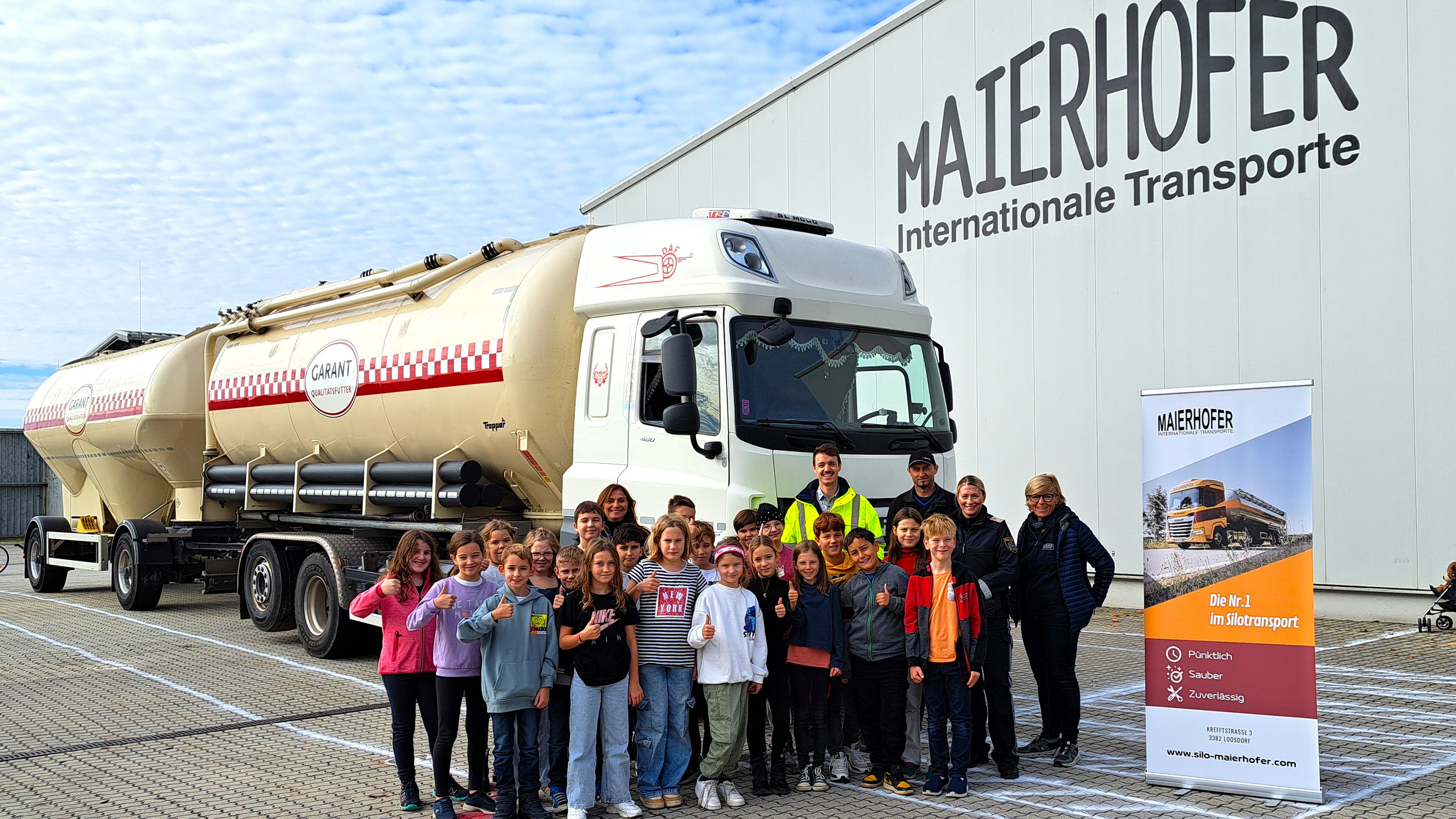 So besuchten die SchülerInnen der 4. Klassen der Volksschule Loosdorf die Transportfirma Maierhofer: In je einem Workshop erarbeiteten die Kinder der zwei 4. Klassen gemeinsam mit Jacob Putz, Unternehmensnachfolger der Fa. Maierhofer, und Workshop-Leiterin Elke Winkler auf spielerische Art alles Wissenswerte zum Thema Lkw – besonderer Schwerpunkt dabei ist immer die Sicherheit im Straßenverkehr. Zu diesem Thema unterstütze auch die Polizeiinspektion Melk durch Kontrollinspektorin Petra Strohmayr.