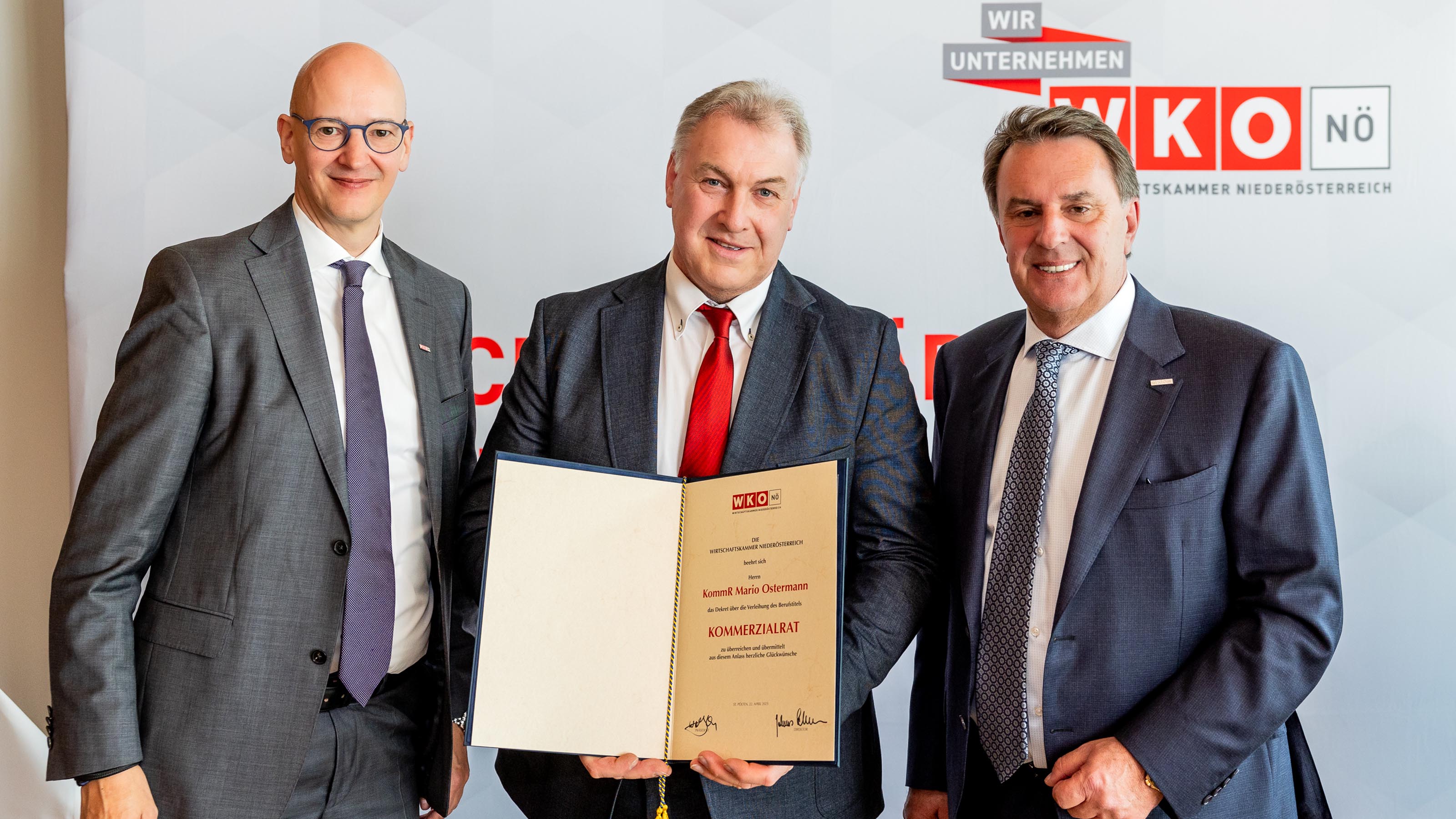 Als verdienter Vertreter der Wirtschaft wurde Mario Ostermann von der Wirtschaftskammer dafür vorgeschlagen - durch die Entschließung von Bundespräsident Alexander Van der Bellen ist der renommierte Unternehmer (Expert Mario Ostermann, Kematen/Ybbs) berechtigt, den Berufstitel „Kommerzialrat“ zu führen. WKNÖ-Präsident Wolfgang Ecker gratulierte Mario Ostermann bei der feierlichen Überreichung des Dekrets.