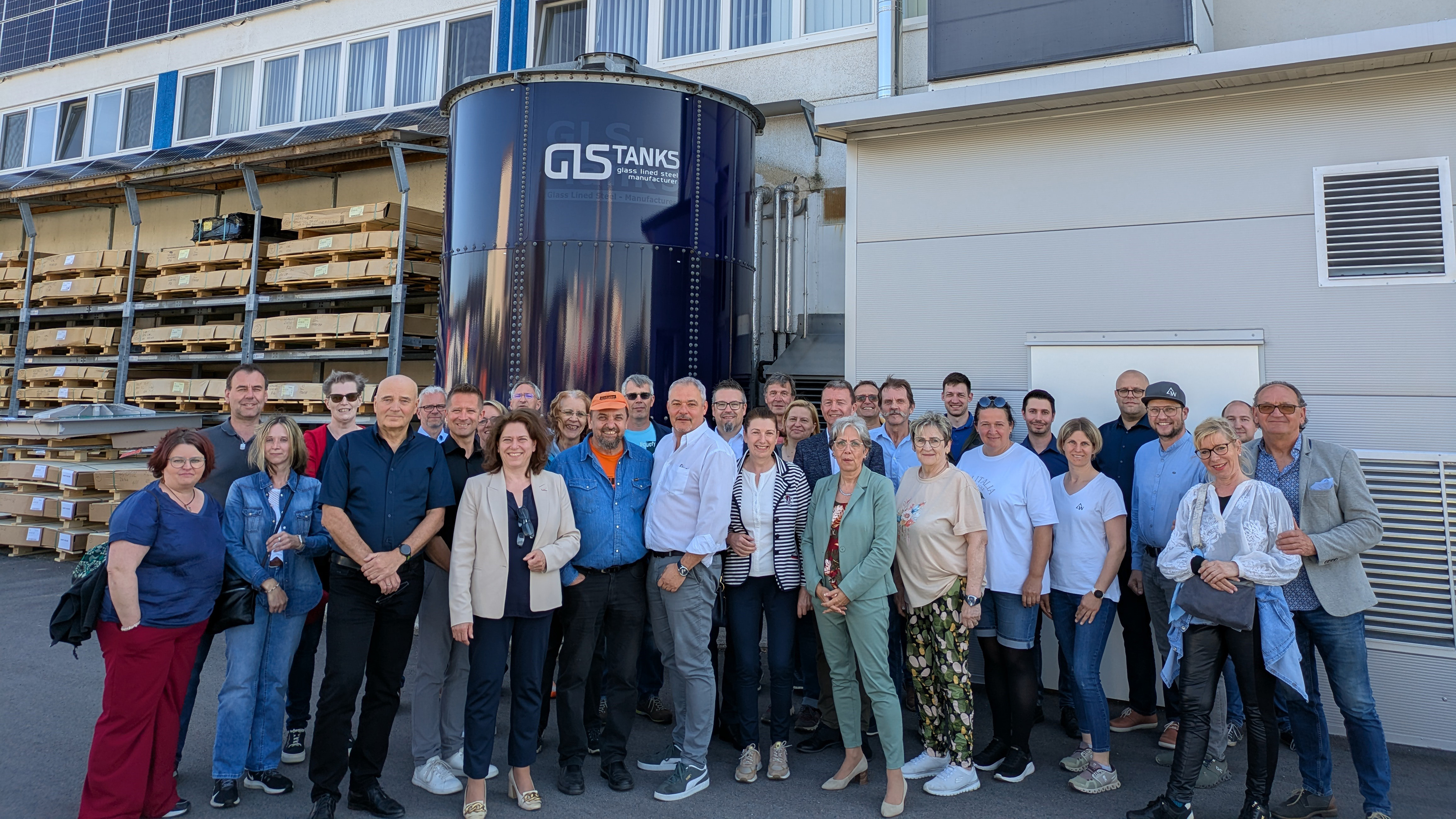Die Teilnehmer:innen konnten sich vor Ort von den modernen Fertigungsmethoden bei der Produktion überzeugen. Die Firma GLS plant, produziert und montiert seit über 30 Jahren weltweit emaillierte Stahltanks und Silos mit einem Exportanteil von über 95 Prozent.
