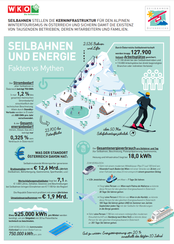 Mit einer Energiemenge von 750 GWh (= 0,75 TWh) benötigen die Seilbahnen einschließlich der technischen Beschneiung einen elektrischen Energieanteil von 1,2 % des österreichischen Gesamtstrombedarfs. Spricht man vom gesamten Energieverbrauch der Seilbahnen inkl. Beschneiung so sind dies NUR 0,325% des Gesamtverbrauchs Österreichs.