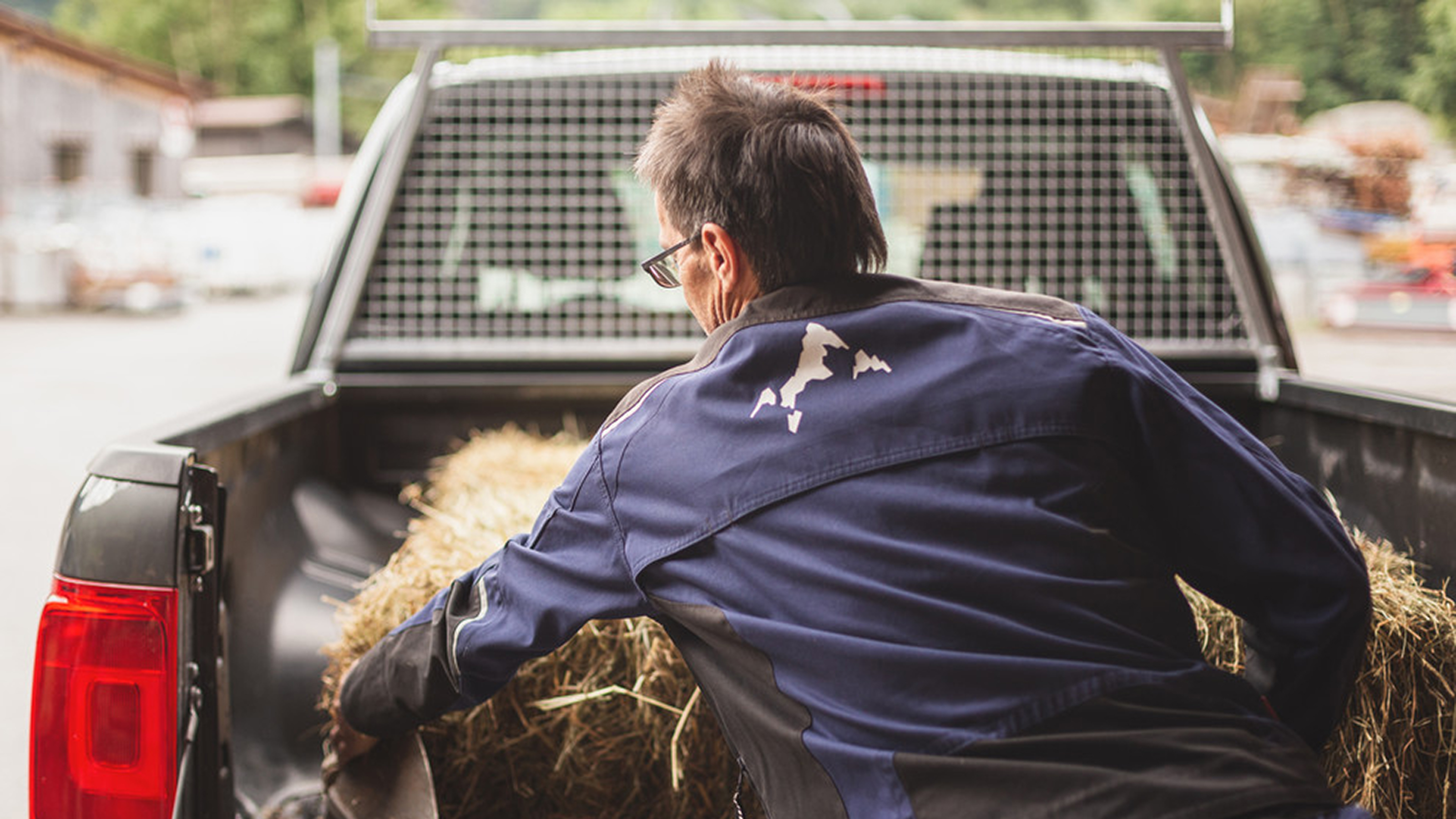 Rückenansicht einer Person, die Heu in ein Auto einladet