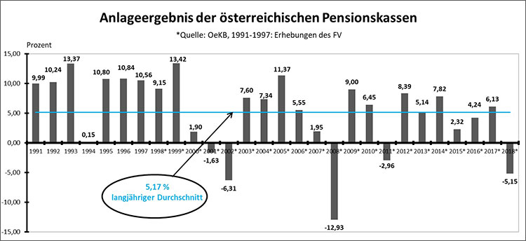 Auch die österreichischen Pensionskassen konnten sich diesem durchgängigen Trend der Märkte, an denen sie veranlagen, nicht gänzlich entziehen. Eine Veranlagung in Aktien in einem bestimmten Anteil ist für kapitalgedeckte Systeme wie bei Betriebspensionen unabdingbar, weil über einen für die Altersvorsorge relevanten Zeitraum von mehreren Jahrzehnten nur mit Aktien eine ausreichend hohe Performance erzielbar ist.