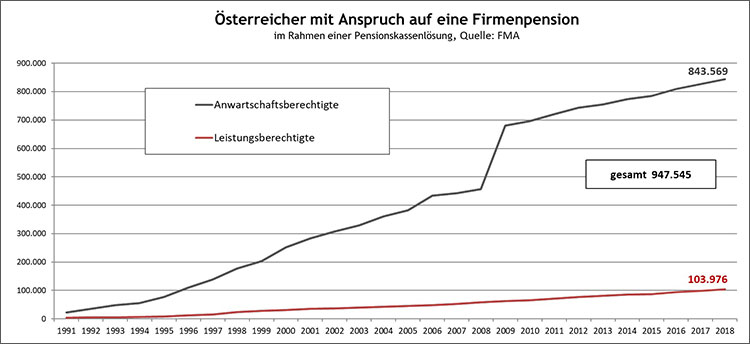 Derzeit haben mehr als 947.000 Österreicher Anspruch auf eine Firmenpension. Insgesamt veranlagen die 9 Pensionskassen ein Vermögen von knapp 22 Mrd. Euro und sind sie damit der größte private Pensionszahler Österreichs.