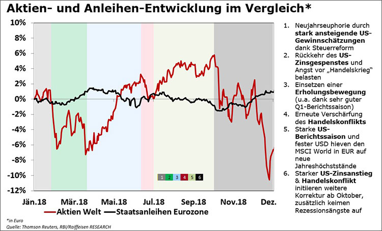 Nach fast zehn Jahren Wachstum an den internationalen Finanz- und Kapitalmärkten dominierte im Jahr 2018 in nahezu allen wichtigen Veranlagungskategorien eine negative Entwicklung. Sowohl Aktien, als auch Unternehmensanleihen und zum Teil sogar Staatsanleihen in der Eurozone, in den Emerging Markets und in den USA entwickelten sich negativ. 2018 war das schlechtestes Börsenjahr seit 2008.