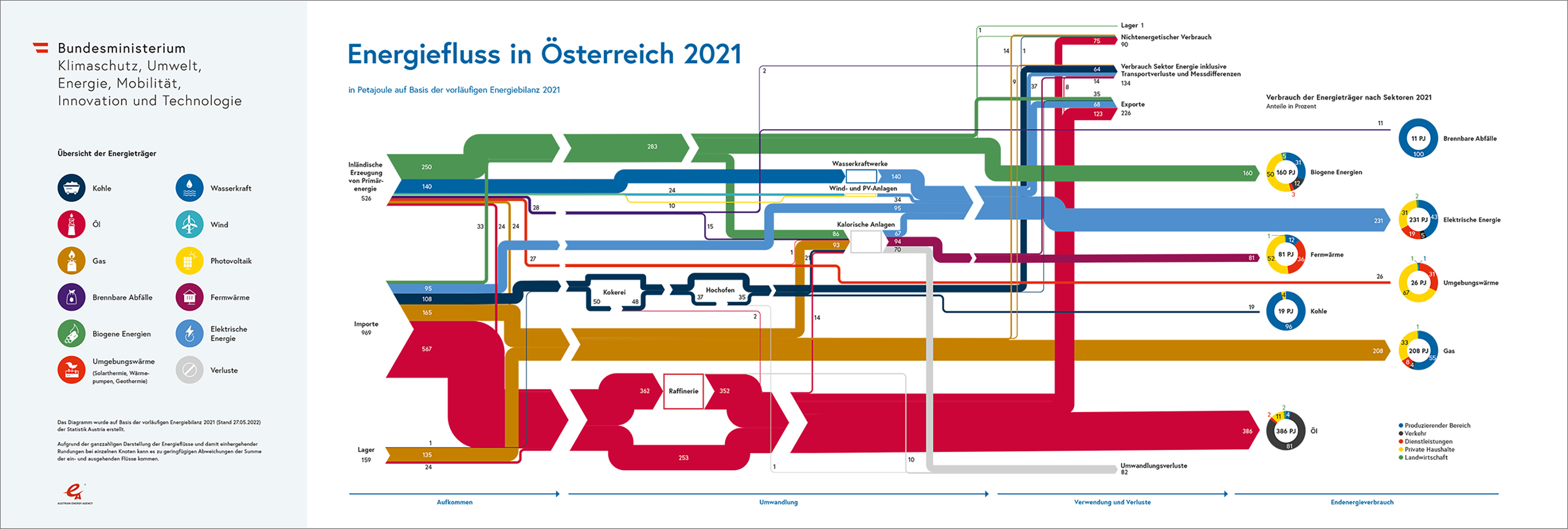 Das Energieflussbild stellt komplexe Zusammenhänge von Energieerzeugung und Energieimport über Umwandlungsprozesse bis hin zur Endenergienutzung in den wesentlichsten Sektoren der Volkswirtschaft dar.