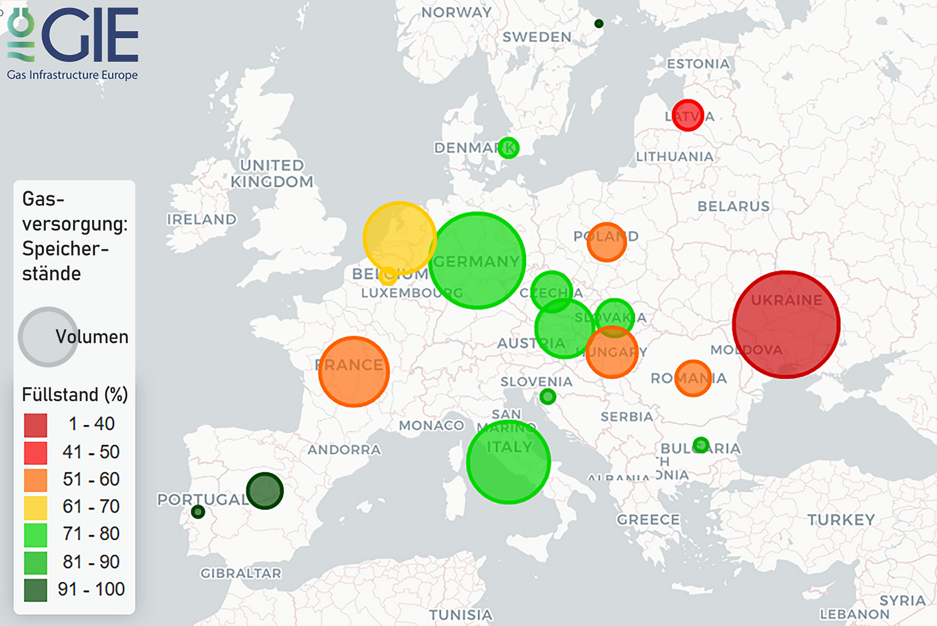 Gas Infrastructure Europe  zeigt die Speichergrößen und -füllstände im Vergleich.