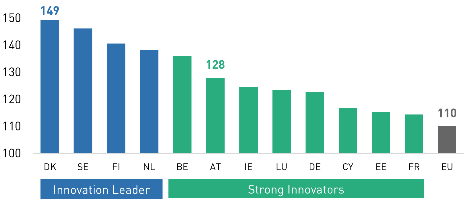 Derzeit befindet sich Österreich auf Platz 6 im European Innovation Scoreboard (EIS 2024), einem europäischen Ländervergleich in Hinblick auf die Innovationsperformance. Österreich liegt damit über dem EU-Durchschnitt und auch über dem Gruppendurchschnitt der „Strong Innovators“. Das Ziel „Innovation Leader“ zu werden, wird derzeit aber noch nicht erreicht.