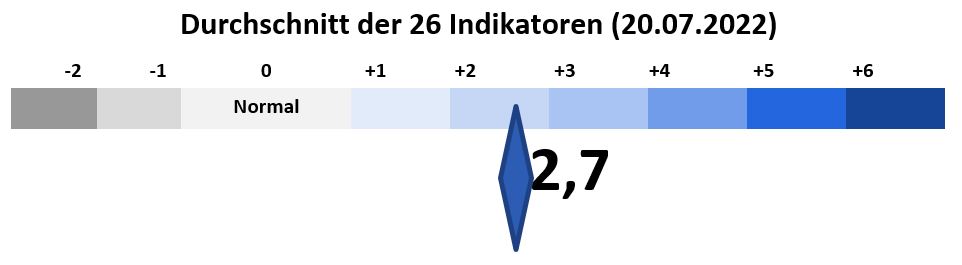 Letztes Update: 20.7.2022, *Abstand vom 10-Jahres Durchschnitt. Der „Normalbereich“ ist durch einen Abstand von jeweils einer Standardabweichung vom Mittelwert definiert. Bei einem Z-Wert von 0 entspricht der aktuelle Wert dem Mittelwert. ** Verkaufspreiserwartungen für die nächsten 3 Monate, Quelle: ESI Business and Consumer Survey.