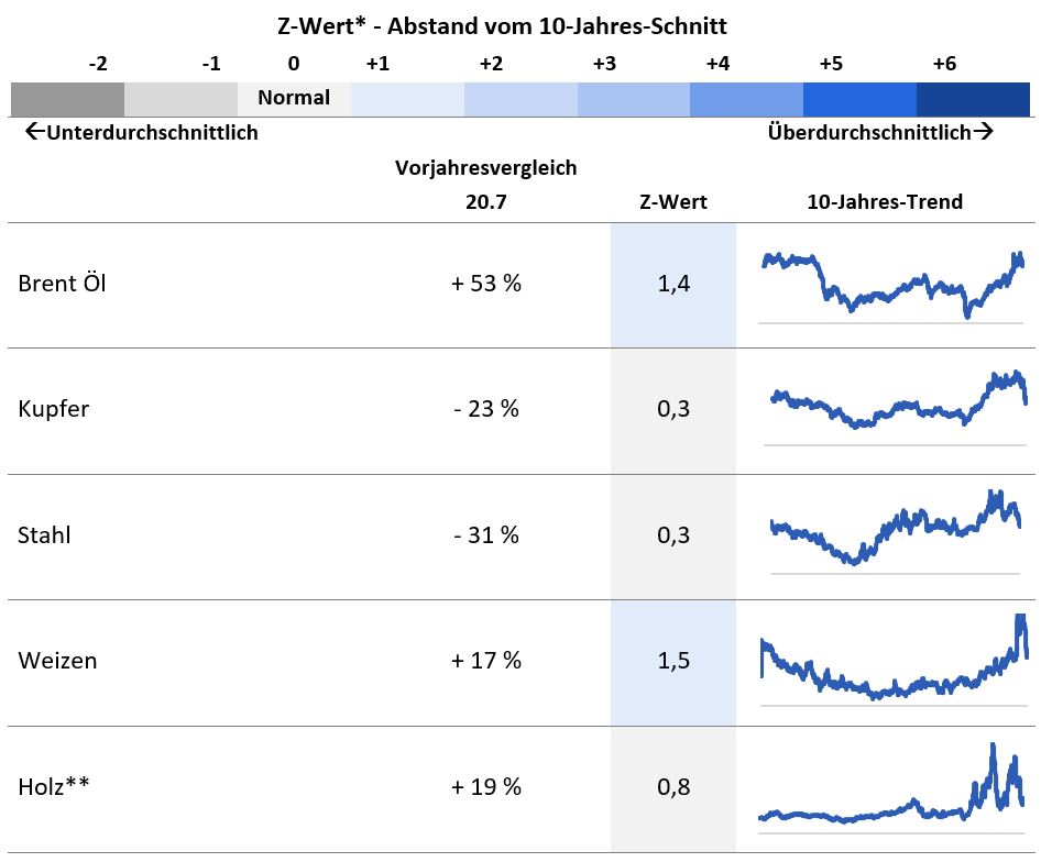 Letztes Update: 20.7.2022, *Abstand vom 10-Jahres Durchschnitt. Der „Normalbereich“ ist durch einen Abstand von jeweils einer Standardabweichung vom Mittelwert definiert. Bei einem Z-Wert von 0 entspricht der aktuelle Wert dem Mittelwert. ** Chicago Lumber Futures, Quelle: Trading Economics.
