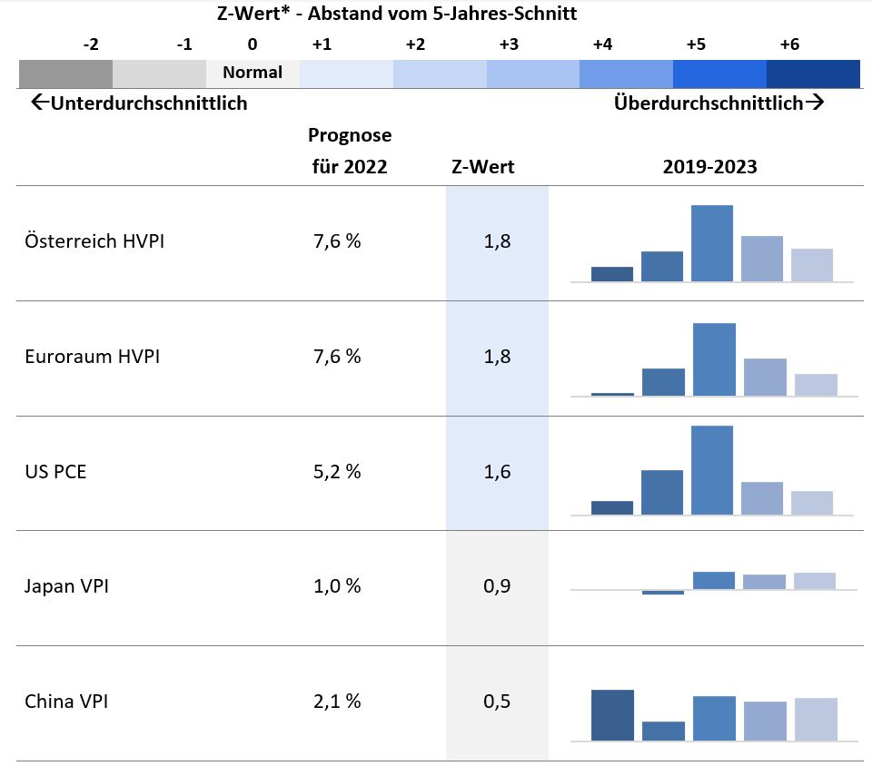 Um die aktuellen Zahlen einordnen zu können, wird der sogenannte Z-Wert berechnet. Dieser ergibt sich aus dem Abstand des aktuellen Wertes vom 10-Jahres-Durchschnitt, dividiert durch die Standardabweichung. Der Z-Wert ist positiv, wenn der aktuelle Wert über dem Durchschnitt liegt und negativ, wenn er darunter liegt. Dadurch kann bestimmt werden, ob die aktuellen Zahlen mittelfristig gesehen im historischen Rahmen liegen oder auf einen besonderen Preisdruck hindeuten. Beträgt der Z-Wert z. B. 2, liegt der aktuelle Wert 2 Standardabweichungen über dem Mittelwert.