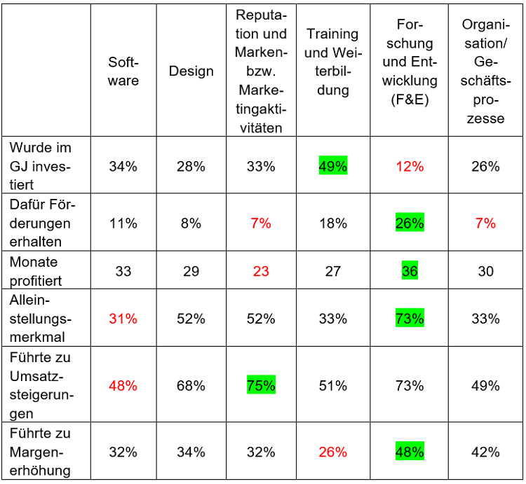 Eine Margenerhöhung aufgrund der vergangenen Investitionen in die jeweiligen Kategorien der immateriellen Vermögenswerte konnte ebenfalls bei allen Kategorien erzielt werden, wobei etwa ein Viertel für Mitarbeiter-Training und -Weiterbildung und knapp 50 % für F&E angegeben wurde.Alle Kategorien der immateriellen Vermögenswerte haben positive Auswirkungen auf Alleinstellungs-Merkmale, Umsatz und Marge