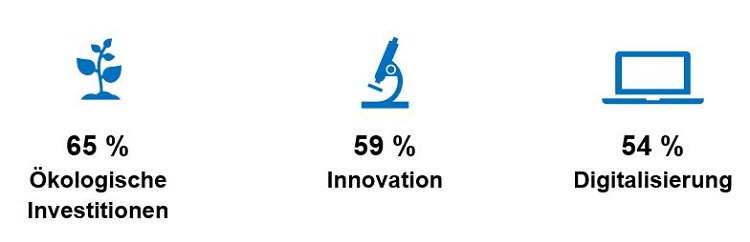 Der Anteil der Unternehmen, der keine Investitionen plant, ist in den vergangenen eineinhalb Jahren gestiegen und liegt nun bei 23 %. Erfreulicherweise planen jedoch 37 % Neuinvestitionen. Der Trend geht in Richtung ökologischer und nachhaltiger Investitionen.