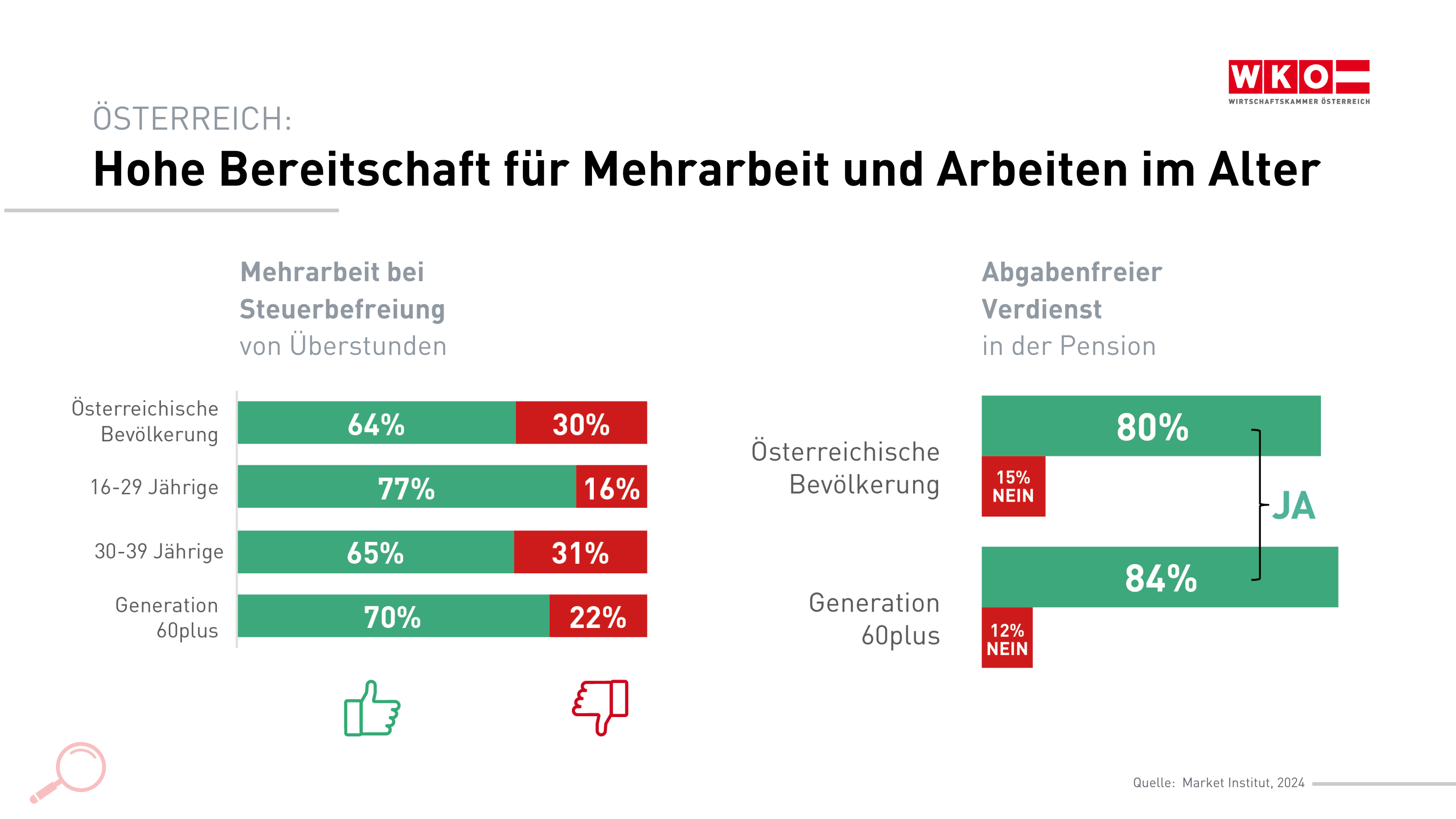 Dabei wären viele Menschen auch bereit, mehr und länger zu arbeiten, wenn die Anreize stimmen. Das zeigen die Ergebnisse einer market-Umfrage: 64% der berufstätigen Personen würden mehr arbeiten, wenn es sich für sie steuerlich auszahlt. Bei den 16- bis 29-Jährigen ist die Bereitschaft zu Mehrarbeit bei steuerbefreiten Überstunden mit 77% sogar noch deutlich höher – so wie übrigens auch in der Generation 60+ mit 70%. Zudem sagen 80% der Österreicher:innen, dass sie länger arbeiten würden, wenn der Zuverdienst in der Pension abgabenfrei wäre, bei der Generation 60+ sind es sogar 84%.