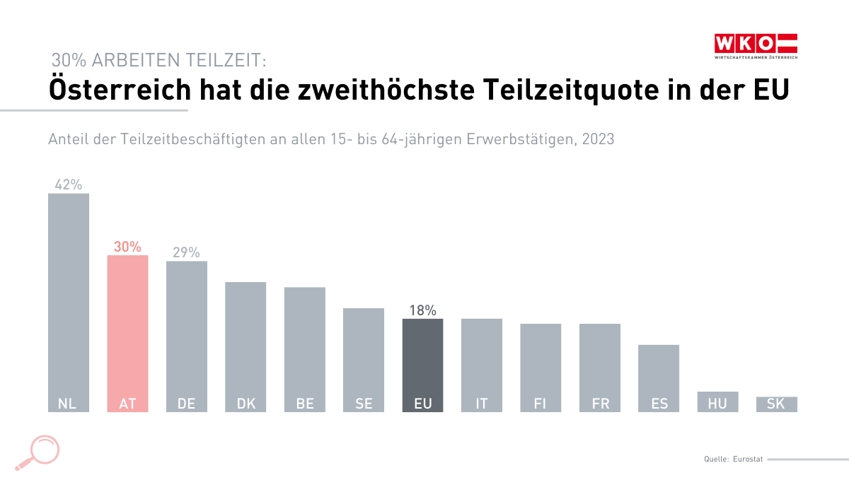Anteil der Teilzeitbeschäftigten bei 30%, Österreich damit auf Platz 2 im EU-Vergleich