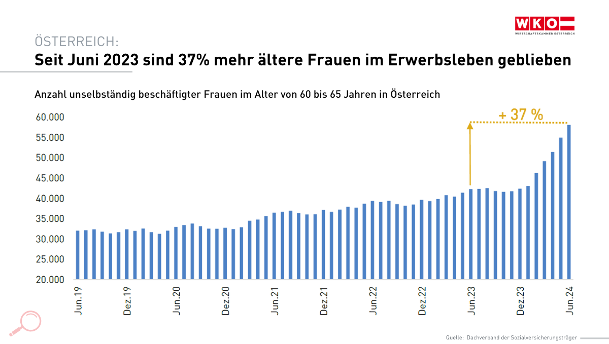 Im Juni 2024 waren um rund 16.000 mehr Frauen im Alter von 60 bis 65 Jahren unselbständig beschäftigt als noch im Juni 2023. Das entspricht einem Zuwachs von 37%, der unter anderem auf die 1992 beschlossene Reform zur schrittweisen Anhebung des gesetzlichen Pensionsalters für Frauen ab Jänner 2024 bis 2033 zurückzuführen ist.