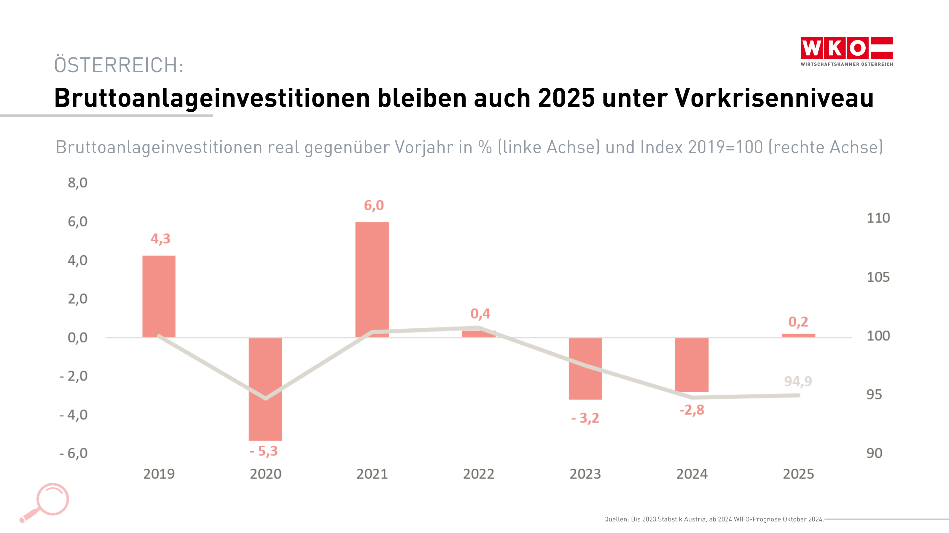 Die multiplen Krisen der letzten Jahre haben die Investitionstätigkeit in Österreich stark belastet, sodass bereits seit 2022 Wachstumsimpulse auf das BIP ausgeblieben sind – mit fataler Wirkung. Denn Investitionen sind nicht nur kurzfristig ein wichtiger Wachstumstreiber. Sie schaffen auch die Voraussetzungen für das langfristige Wachstumspotenzial einer Volkswirtschaft. Nach den Rückgängen im vergangenen Jahr und 2024 ist laut aktueller WIFO-Konjunkturprognose auch 2025 keine Erholung in Sicht. Mit einem prognostizierten Nullwachstum bleibt das Investitionsvolumen auch im kommenden Jahr merklich unter dem Vorkrisenniveau 2019.