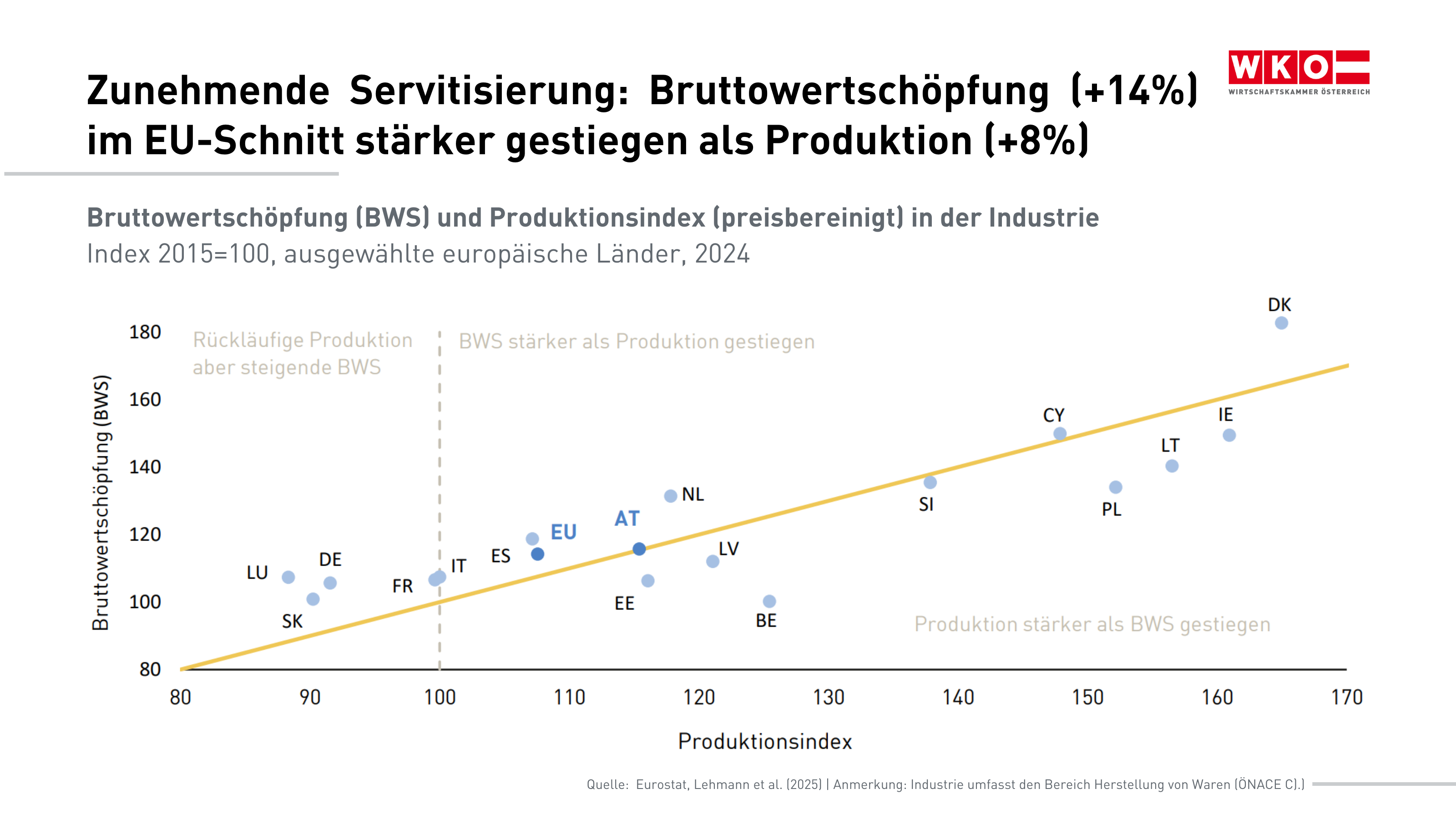 Für Österreich könnte die traditionelle Rolle als Zulieferstandort, insbesondere in der Automobilindustrie, eine mögliche Erklärung dafür sein, dass die strategische Erweiterung industrieller Aktivitäten um Dienstleistungen (Servitisierung) bislang nur begrenzt erfolgte. Solche produktbegleitenden Services entstehen typischerweise vermehrt im Umfeld von ausgeprägten Endfertigungsstrukturen.