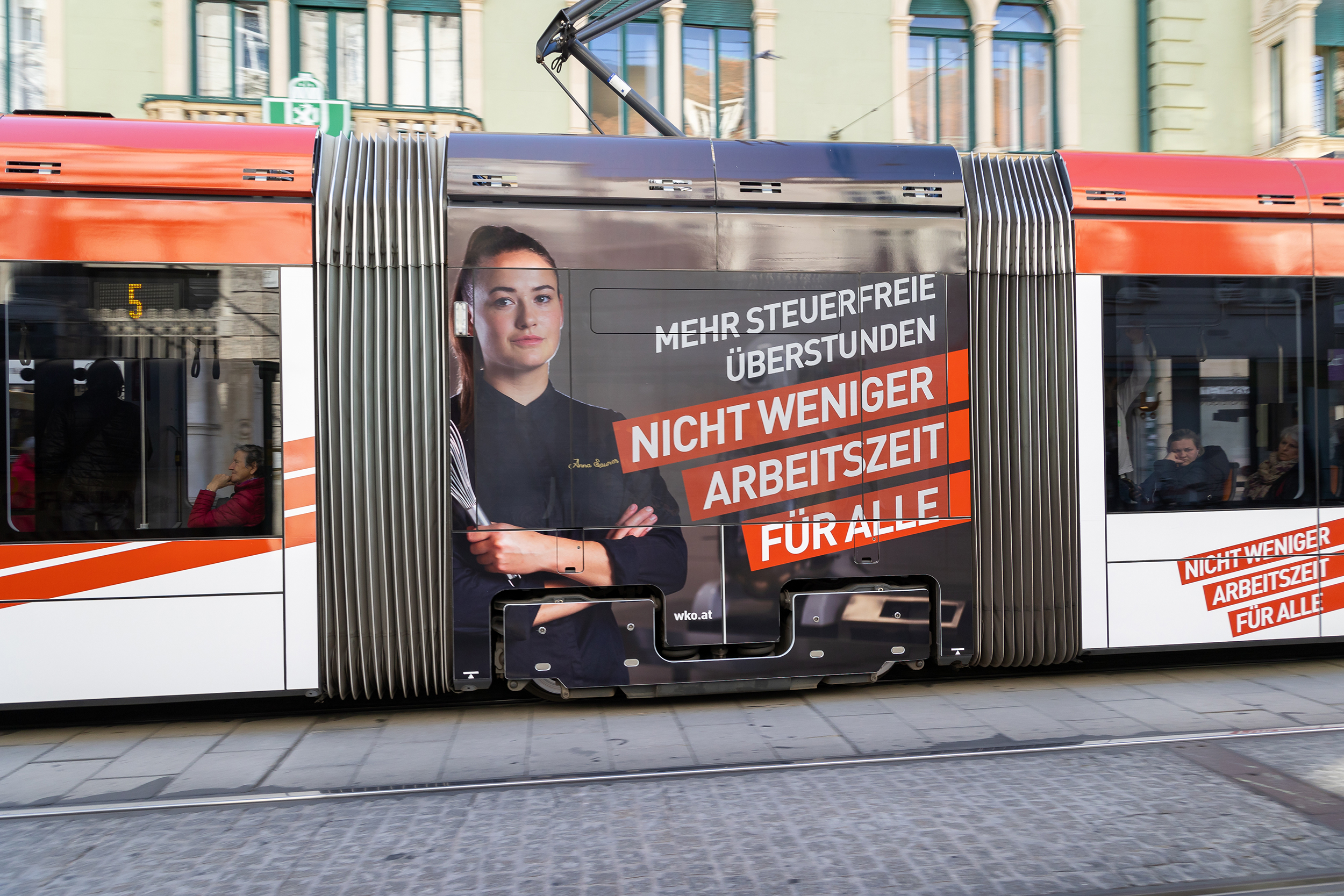 Wenn die SPÖ in Graz ihren Parteitag begeht, dann wird auch wieder die Forderung nach einer generellen Arbeitszeitverkürzung auf 32 Wochenstunden bei vollem Lohnausgleich erhoben werden. Die neue Kampagne der WKÖ - #meinearbeit - will den Wert von Arbeit wieder stärker in den Mittelpunkt rücken. Deshalb wirbt auch die Bim in Graz für "Nicht weniger Arbeitszeit für alle" (Foto downloaden Copyright: WKÖ).