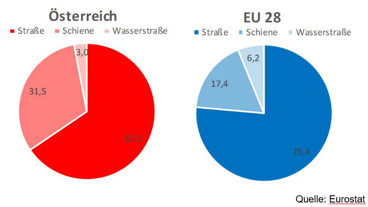 Güter-Modal Split im Landverkehr 2016 in Österreich im Vergleich mit der EU