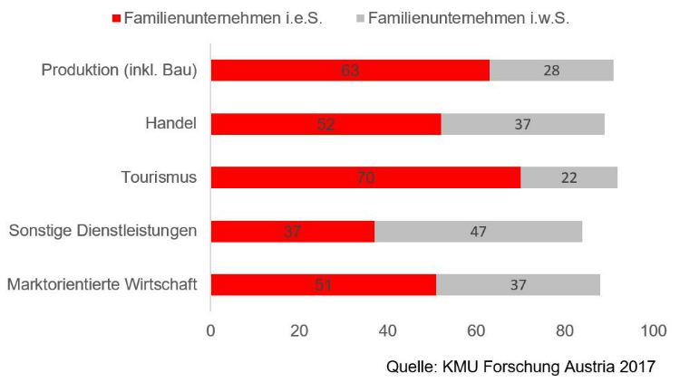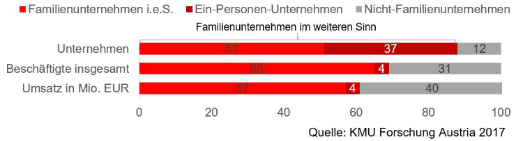 Die aktuelle Studie der KMU Forschung Austria zeigt, dass es sich bei rund 88 % der Unternehmen in Österreich um Familienunternehmen laut EU-Definition handelt (Familienunternehmen im weiteren Sinne (i.w.S.)). Lässt man die Anzahl der Ein-Personen-Unternehmen außer Acht, beträgt der Anteil der „Familienunternehmen im engeren Sinn“ (i.e.S.) mit 51 % immer noch mehr als die Hälfte der österreichischen Unternehmen. Ihnen sind 65 % aller selbständig und unselbständig Beschäftigten zuzurechnen, das entspricht rund 1,8 Millionen Personen sowie 57 % oder ungefähr 394 Milliarden Euro der Umsätze.