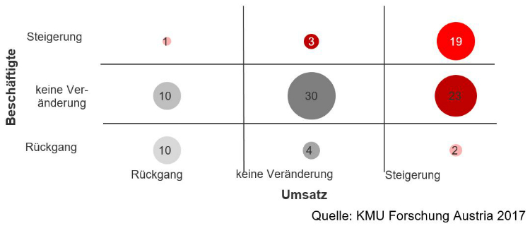 Eine gemeinsame Betrachtung von Umsatz und Beschäftigung zeigt, dass bei der größten Gruppe der Unternehmen (30 %) sowohl der Umsatz als auch die Anzahl der Beschäftigten in den letzten vier Jahren stabil geblieben ist. 23 % haben die Umsätze bei einem gleichbleibenden Beschäftigtenstand erhöhen können. Bei 19 % sind sowohl die Umsätze als auch die Anzahl der MitarbeiterInnen gestiegen.