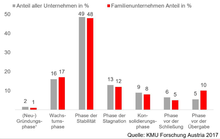 In Österreich handelt es sich bei rund 51 % der Unternehmen um Familienunternehmen. Die Bandbreite der Familienunternehmen reicht vom kleinen Handwerksbetrieb bis hin zum weltweit erfolgreichen Großkonzern. Ein typisches Merkmal von Familien unternehmen ist deren Langlebigkeit, die Entscheidungsstruktur wie auch die Einbindung von Familienmitgliedern in das Unternehmen. Auch Familienunternehmen befinden sich mehrheitlich in der Reifephase.