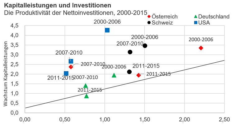 In den USA und der Schweiz waren die Nettoinvestitionen produktiver als in Deutschland bzw. Österreich, mit einem geringeren Aufwand konnten mehr Kapitalleistungen geschaffen werden. Besonders ungünstig ist die Lage in Deutschland, wo mit nur etwas geringeren Investitionen als in der Schweiz kaum die Hälfte der Kapitalleistungen erreicht werden konnte.