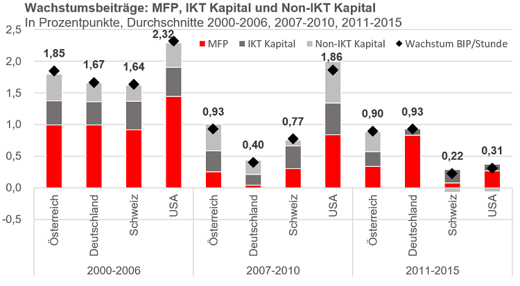 Österreich weist somit einen ähnlich hohen Wachstumsbeitrag der Kapitalvertiefungen auf wie die USA, allerdings ist der MFP-Beitrag in den USA mit 0,85 Prozentpunkten deutlich höher als in Österreich. In Deutschland ist der Beitrag der Kapitalvertiefung geringer (0,4 Prozentpunkte), während die MFP 0,62 Prozentpunkte zum Wachstum der Arbeitsproduktivität von rund 1 % pro Jahr beiträgt. Die Schweiz weist mit 0,9 % pro Jahre das geringste Produktivitätswachstum auf, was sich aus gleichen Teilen aus der Kapitalvertiefung und der MFP zusammensetzt.