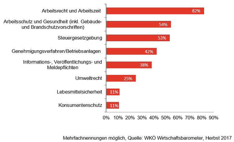 Österreichische Unternehmer beklagen finanzielle und zeitliche Belastungen, die nicht in direktem Zusammenhang mit ihrer unternehmerischen Tätigkeit stehen. Laut WKÖ Wirtschaftsbarometer vom Herbst 2017 lassen sich diese in den meisten Fällen auf Rechtsvorschriften zurückführen, die das Arbeitsrecht und die Arbeitszeit betreffen (82 % der Nennungen).