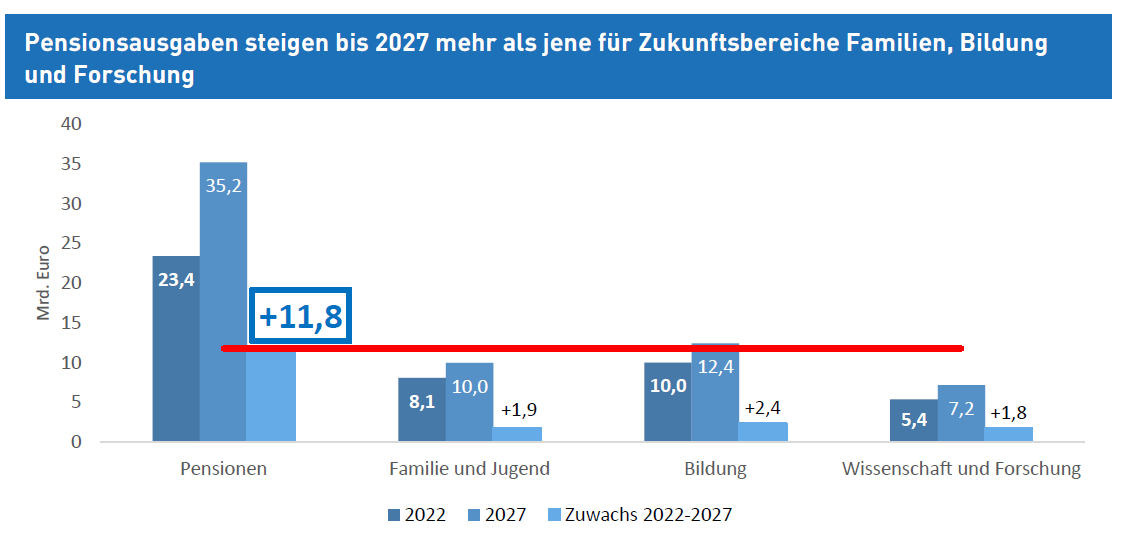 Gleichzeitig steigen die Ausgaben in den nächsten Jahren weiter stark an. Die Ausgaben des Bundes erhöhen sich zwischen 2022 und 2027 um 15 % von 111 auf 128 Mrd. Euro. Getrieben wird diese Entwicklung vor allem durch die hohen Mehraufwendungen für Pensionen, die in diesem Zeitraum um rund 12 Mrd. Euro steigen und für über 70 % des Ausgabenwachstums verantwortlich sind. Damit ist der Anstieg der Pensionskosten größer als die aktuellen Aufwendungen für Familien und Jugend, Bildung oder Wissenschaft und Forschung. Im Jahr 2027 werden die Pensionszahlungen für fast 28 % der gesamten Bundesausgaben verantwortlich sein.
