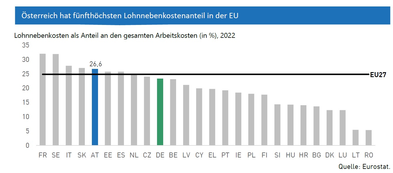 In kaum einem anderen EU-Land zahlen Arbeitgeber mehr Lohnnebenkosten als in Österreich. Diese sind, oft unbemerkt für Arbeitnehmer:innen, zusätzlich zu den Bruttolöhnen und -gehältern von Unternehmen für ihre Beschäftigten zu entrichten. Sie umfassen unter anderem Sozialversicherungsbeiträge sowie Kommunalsteuern und machen in Österreich knapp 27 % der gesamten Arbeitskosten aus. Zum Vergleich: In Deutschland belaufen sie sich auf nur 23 % der Arbeitskosten. Österreich hatte 2022 den fünfthöchsten Lohnnebenkostenanteil an den Arbeitskosten in der EU. Damit verschlechterte sich Österreichs Position im Zeitvergleich, denn im Jahr 2012 hatte Österreich bloß die achthöchste Lohnnebenkostenbelastung in der EU.