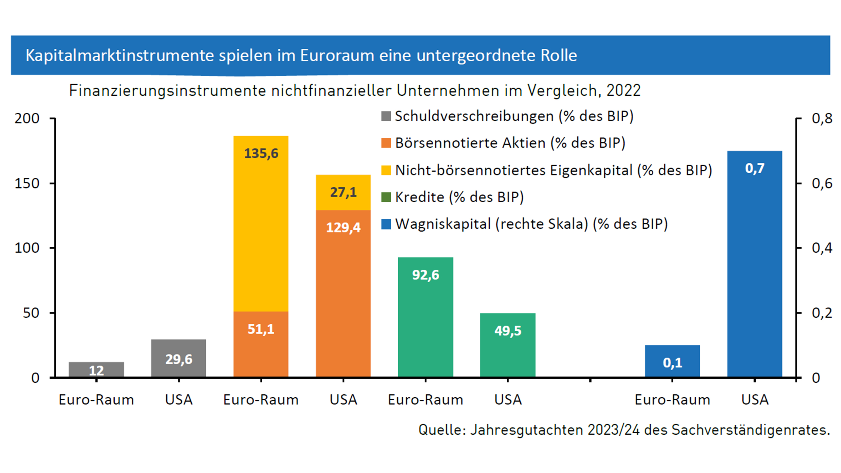 Im Vergleich mit den USA fällt neben der geringen Wagniskapitalquote (0,1 % des BIP) besonders der hohe Anteil an nicht-börsennotiertem Eigenkapital (135,6 % des BIP) im Euroraum auf. Letzteres ist zwar grundsätzlich dem Kapitalmarkt zuzurechnen, aber weniger liquide als börsennotierte Aktien, was zu niedrigeren Unternehmensbewertungen führt.