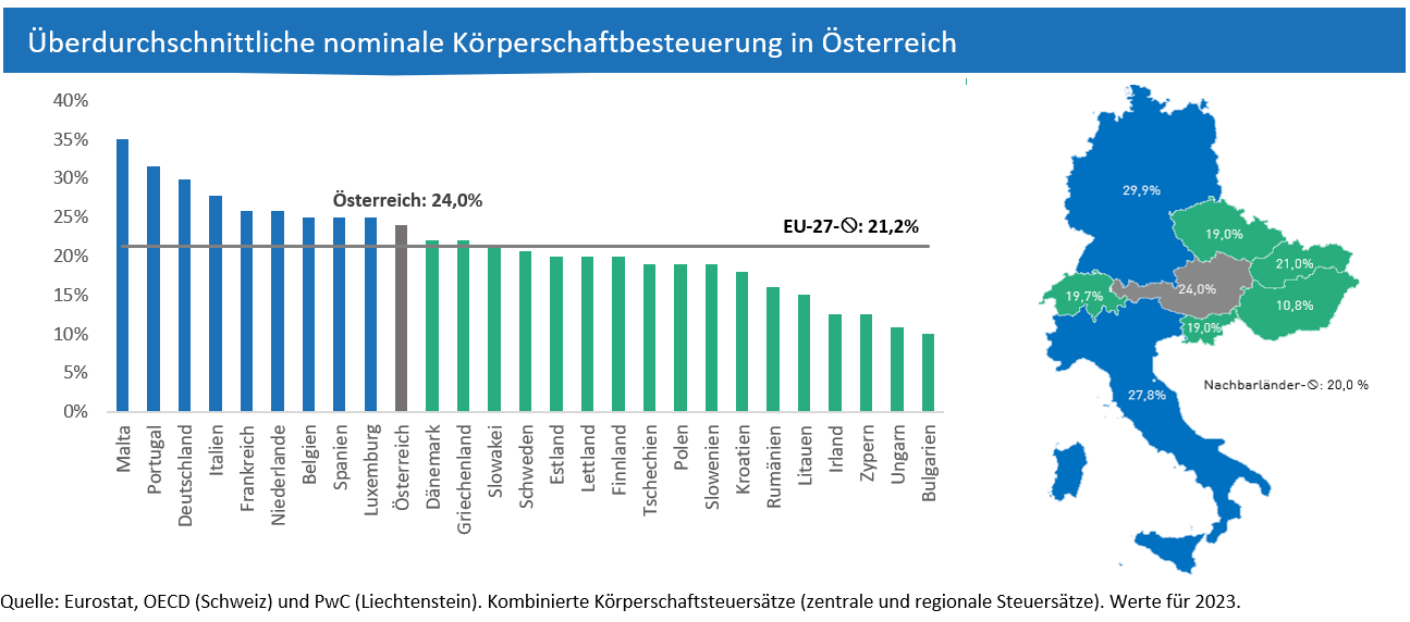 Mit aktuell 24 % befindet sich Österreich unter den zehn EU-Ländern mit der höchsten nominalen Körperschaftsteuerbelastung und liegt um 2,8 Prozentpunkte über dem EU-27-Schnitt (21,2 %). Betrachtet man unsere Nachbarländer, ist der Abstand zu deren Durchschnittswert (20 %) mit vier Prozentpunkten noch größer. Nur Deutschland (29,9 %) und Italien (27,8 %) haben höhere nominale KöSt-Sätze als Österreich. Ungarn (10,8 %), Slowenien (19 %), Tschechien (19 %) und die Slowakei (21 %) sowie Liechtenstein (12,5 %) und die Schweiz (19,7 %) liegen zum Teil deutlich unter dem österreichischen Niveau. Die Senkung des KöSt-Satzes auf 23 % im nächsten Jahr ist daher zwar ein richtiger Schritt, wird jedoch an der grundsätzlichen Situation nichts Wesentliches ändern.