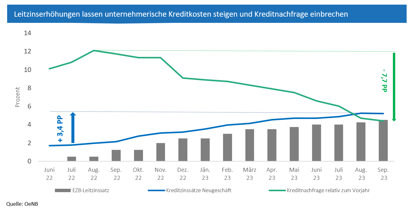 Die Leitzinserhöhungen der EZB von 0 % auf 4,5 % zwischen Juli 2022 und September 2023 haben starke Auswirkungen auf die Kreditkosten und die Kreditnachfrage der Unternehmen. So stiegen die Zinsen für neue Unternehmenskredite um 3,4 Prozentpunkte von 1,8 % (Juni 2022) auf 5,2 % (September 2023) an. Die erhöhten Kreditkosten im Zusammenhang mit den bestehenden wirtschaftlichen und geopolitischen Unsicherheiten reduzierten die Nachfrage nach Unternehmenskrediten massiv. Nachdem das Wachstum des aushaftenden Kreditbestandes im August 2022 – relativ zum Vorjahr – mit 12,1 % den höchsten Wert seit Aufzeichnungsbeginn 1998 erreicht hatte, fiel die Jahreswachstumsrate bis September 2023 konstant um