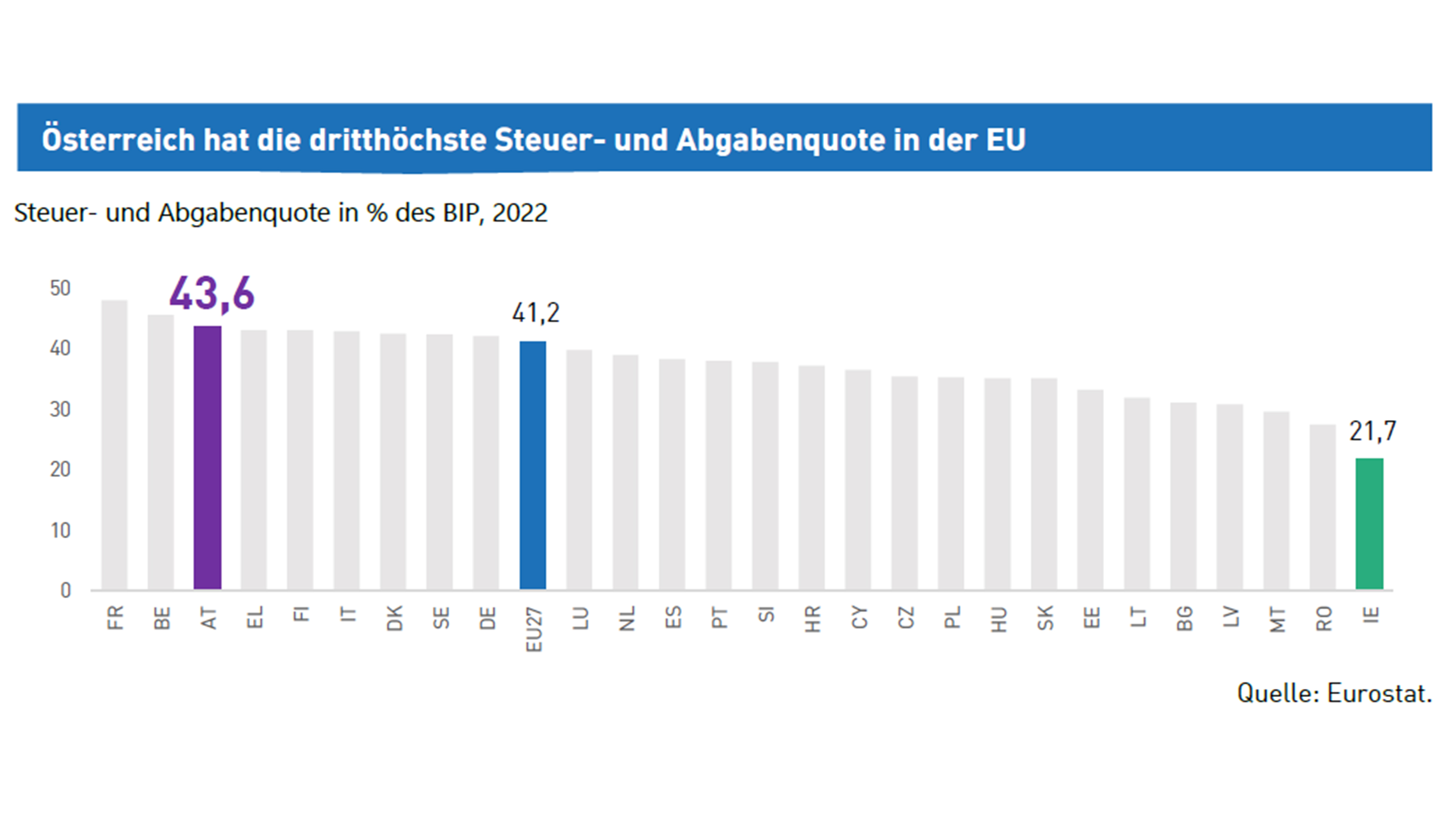 Im europäischen Vergleich rutscht Österreich bei der Steuer- und Abgabenquote weiter ab. Mit einer Quote von 43,6 % lagen wir 2022 hinter Frankreich und Belgien auf dem dritten Rang. Im Vergleich zum Vorpandemiejahr 2019 ist das eine Verschlechterung um zwei Plätze. Positiver Spitzenreiter ist Irland, wo die Steuer- und Abgabenquote lediglich 21,7 % des BIP ausmacht. Selbst Schweden, dem traditionell der Ruf eines Hochsteuerlandes anhaftet, hat eine niedrigere Steuerquote (42,4 %) als Österreich.
