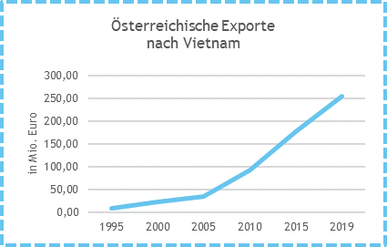 Das Handelsvolumen zwischen Österreich und Vietnam hat sich seit 1995 von 31,5 Mio. auf 1,25 Mrd. Euro erhöht. Die österreichischen Warenexporte betrugen 2019 254 Mio Euro, die Dienstleistungsexporte 81 Mio. Euro.