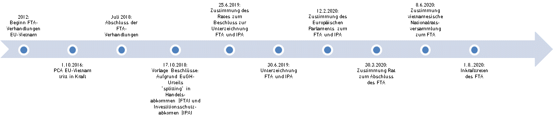 Das Handelsabkommen der EU mit Vietnam ist das umfassendste Abkommen, das die EU jemals mit einem Entwicklungsland abgeschlossen hat. Es wurde am 30. Juni 2019 von beiden Vertragsparteien unterzeichnet. Die EU-internen Verfahren für das Inkrafttreten des Abkommens (Zustimmung des Rates und des Europäsiche Parlaments) sind bereits abgeschlossen. Nach Zustimmung der vietnamesischen Nationalversammlung am 8. Juni 2020 tritt das Handelsabkommen am 1. August 2020 in Kraft.