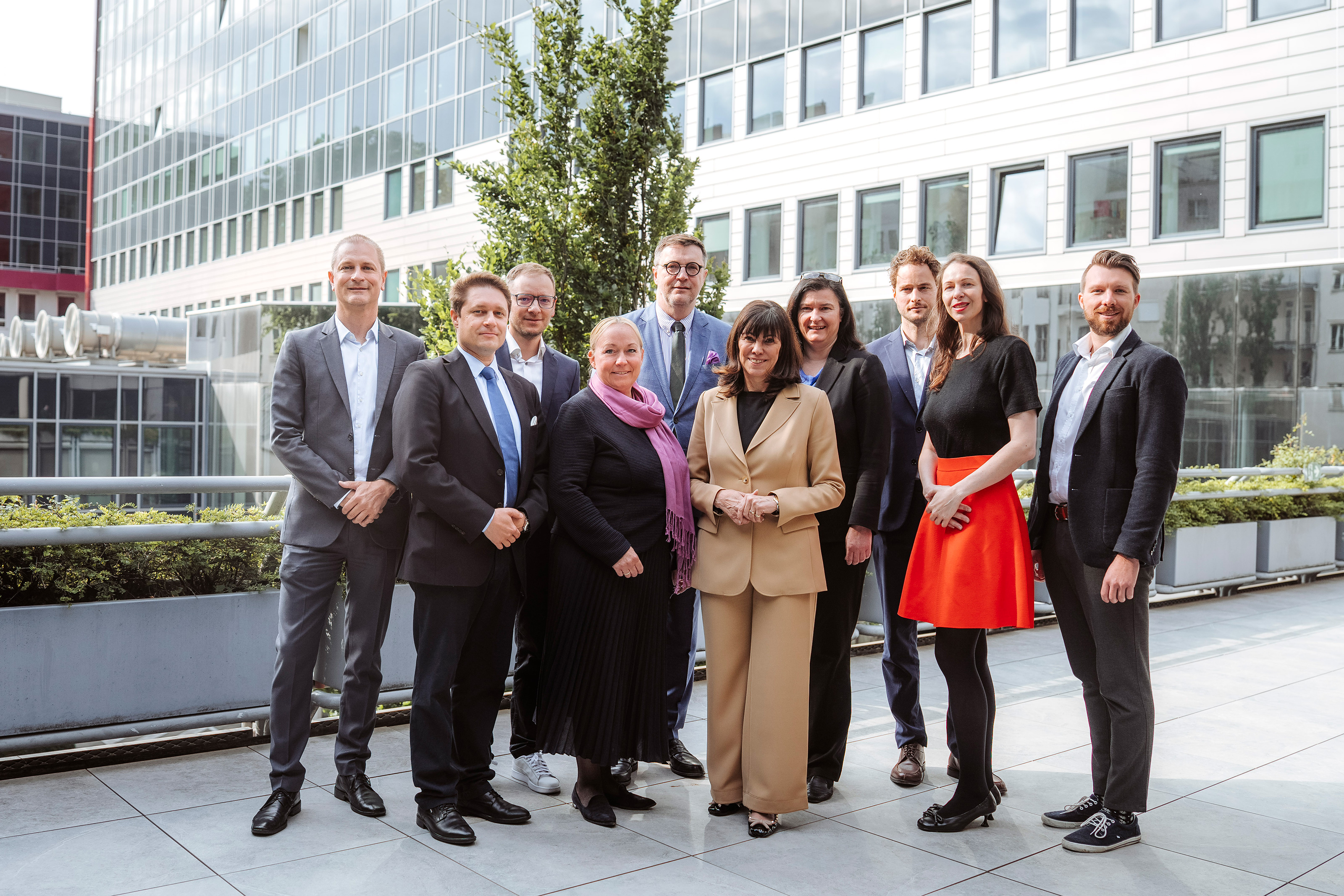 Gruppenfoto zum Download © WKÖ/Nadine Studeny - Bildtext (v.l.): Winfried Pöcherstorfer (WKÖ), Andreas S. Rath (Ondewo), Mario Luef, Rosemarie Schön (WKÖ Rechtspolitik), Klaus M. Steinmaurer (RTR GmbH), WKÖ-Vizepräsidentin Martha Schultz, Verena Krawarik (APA), Matthias Strafinger (deine KI Agentur), Karin Sommer (WKÖ Innovation und Digitalisierung), Dominik Wörz (alpLytics)