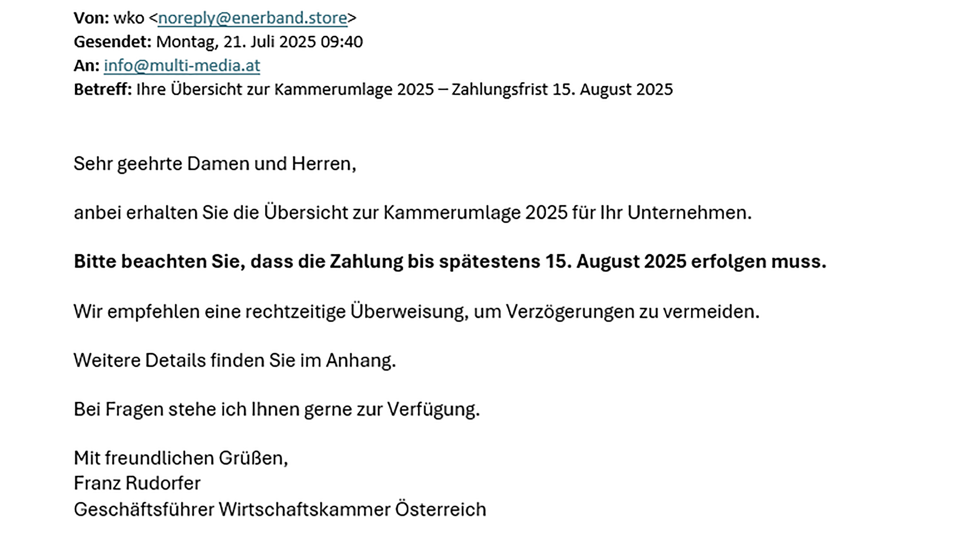 Derzeit werden gefälschte E-Mails mit dem Betreff „Ihre Übersicht zur Kammerumlage 2025 – Zahlungsfrist 15. August 2025“ versendet. Diese Nachricht stammt nicht von der Wirtschaftskammer Oberösterreich.