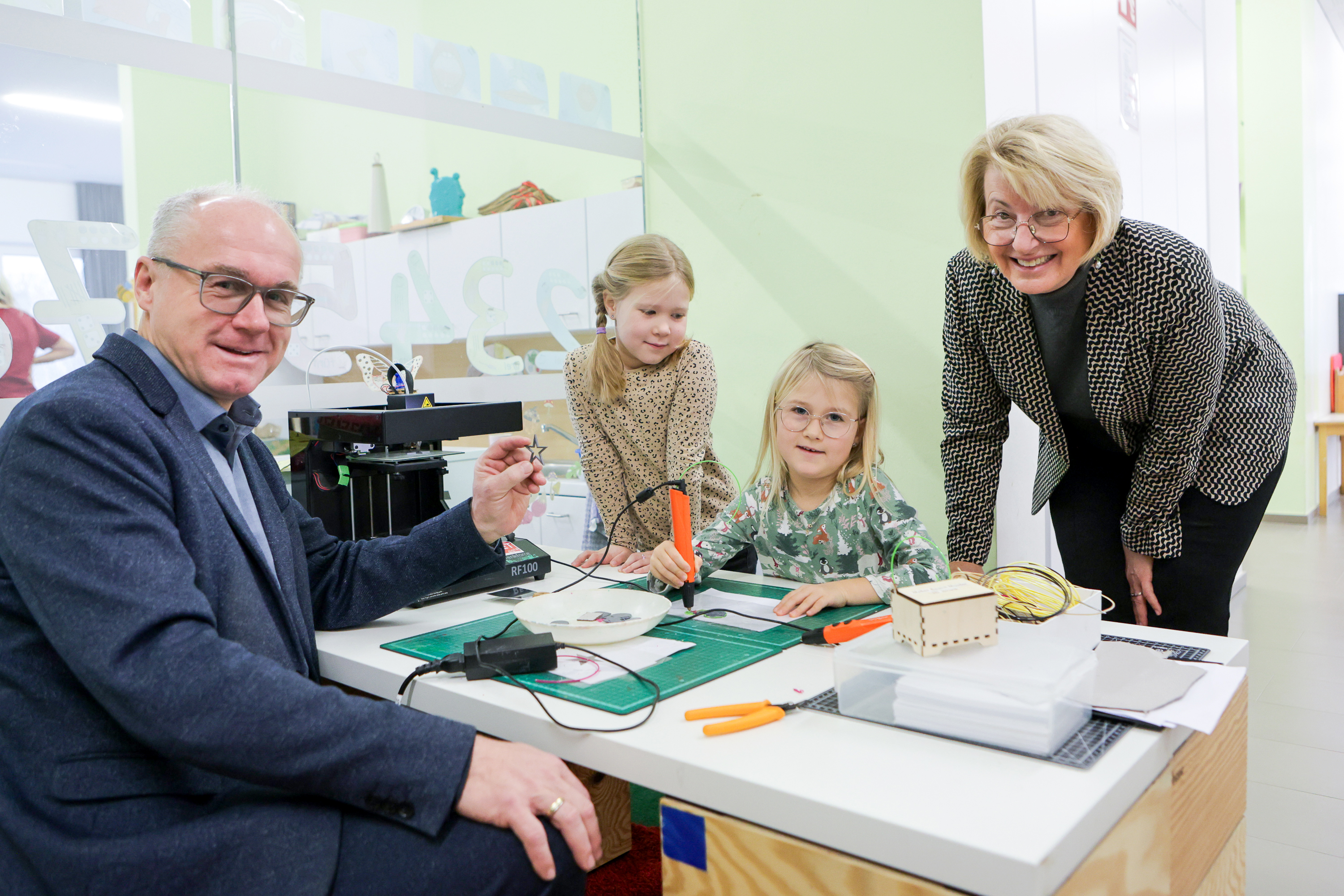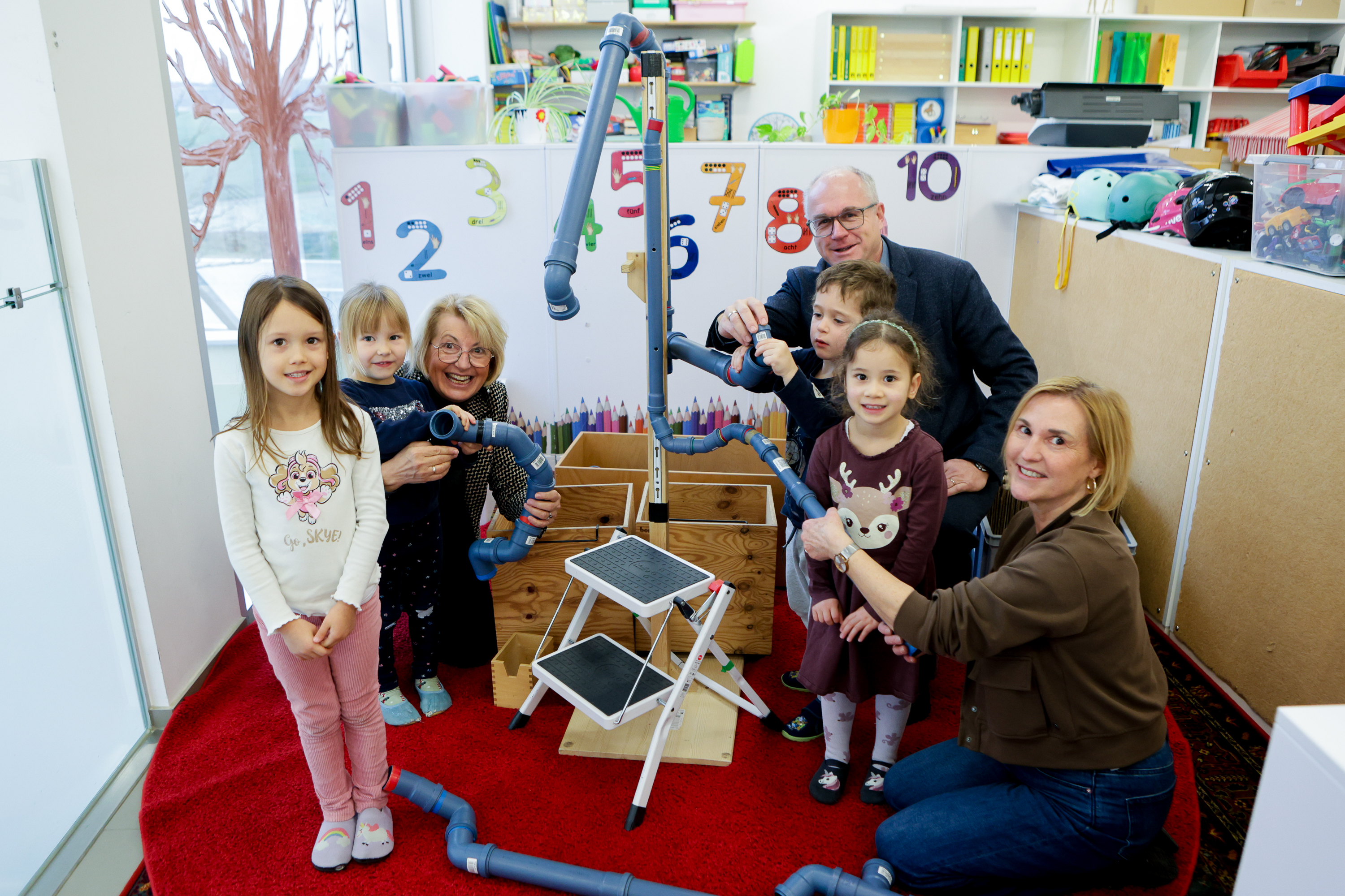 Kindergartenleiterin Christa Schmidleitner, Bürgermeisterin Maria Pachner, WKO-Bezirksstellen-Obmann Günther Baschinger und WKO-Bezirksstellen-Leiter Hans Moser freuten sich über das große Interesse, die diese Wanderausstellung, finanziert von der WKO Oberösterreich und dem Bildungsressort des Landes Oberösterreich, bei den Kindergartenkinder auslöste. Mit großer Freude wurde gespielt.