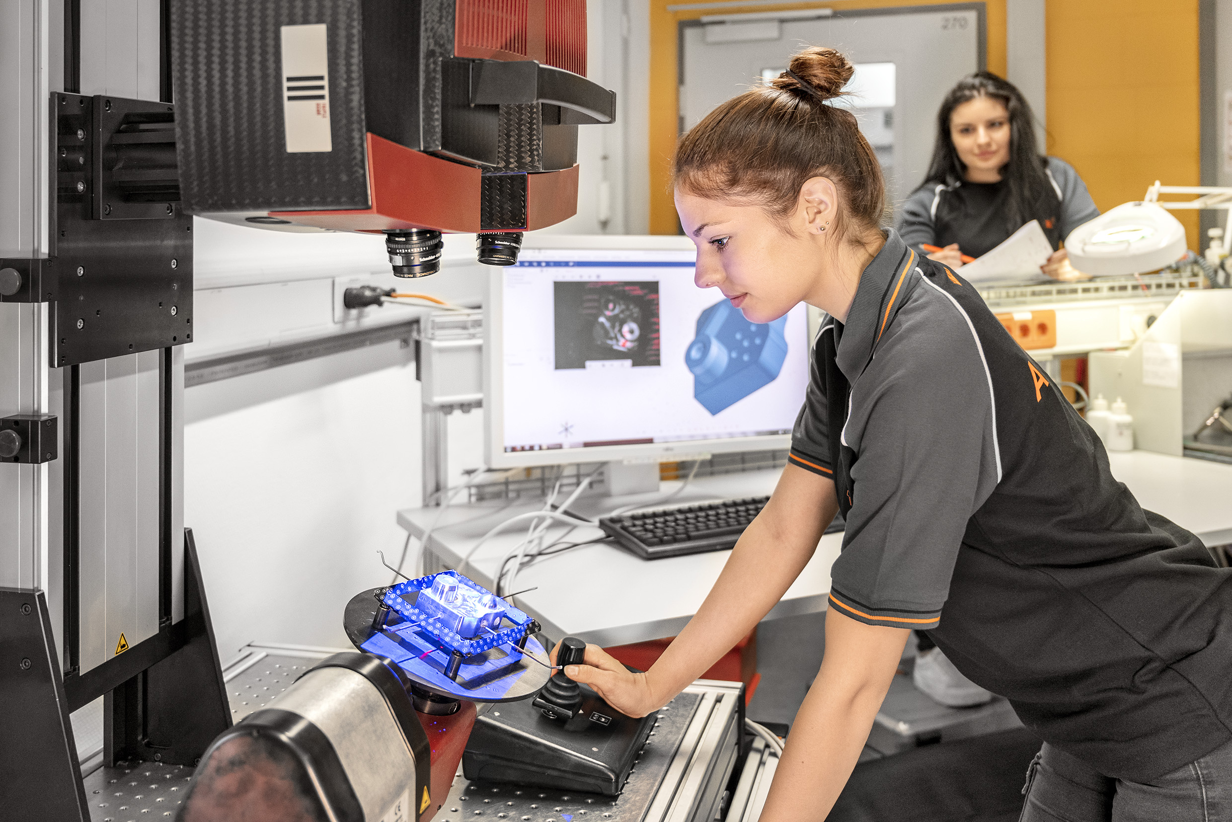 Ein Betrieb, der seit Beginn dieses Lehrjahrs zwei Fertigungsmesstechniker ausbildet, ist der Höchster Beschlägehersteller Blum: „Digitale Inhalte, der Umgang mit modernen Techniken sowie Arbeitsgeräten spielen bei uns quer durch alle Lehrberufe eine große Rolle. Ganz besonders trifft das aber auf den neuen Lehrberuf Fertigungsmesstechnik zu", weiß Simon Bauer, Ausbildungsverantwortlicher für Zerspanungs- und Fertigungsmesstechnik. Mit anspruchsvollen Mess- und Prüfmethoden erheben Fertigungsmesstechnikerinnen und Fertigungsmesstechniker verschiedene Daten wie geometrische Maße, Stückzahlen und Mengenangaben, Gewichte oder die Beschaffenheit von Werkstoffen. Die aufgearbeiteten Daten gehen dann anschließend zur Qualitätskontrolle. „Somit ist die Fertigungsmesstechnik ein wichtiges Bindeglied zwischen der Produktion und Qualitätssicherung“, erklärt Simon Bauer und ergänzt: „Was auf den ersten Blick vielleicht nicht besonders spannend oder herausfordernd klingt, erscheint in einem anderen Licht, wenn man weiß, mit welchen Messgeräten wir tagtäglich arbeiten: Vom Computertomographen über Streifenlichtprojektoren und Koordinatenmessgeräten bis hin zu 3D-Messungen mit computergestützten Auswertungen.“ So werden Bauteile beispielsweise digital abgebildet und mit dem CAD-Sollvolumen abgeglichen. Diese Tendenz ist unter anderem der Tatsache geschuldet, dass Bauteile immer kleiner und komplexer werden, sodass sie oft für das Auge kaum mehr erfassbar sind. Jeremy Lampert und Pablo Zabelitzky, die im Herbst 2020 ihre Ausbildung bei Blum begonnen haben, lernen zu Beginn alles über die Bauteilherstellung: „Es ist wichtig, dass unsere Lehrlinge in diesem Bereich wissen, wie wir Bauteile herstellen und wofür wir sie verwenden. Nur so bekommen sie einen Bezug zur Messtechnik“, ergänzt Simon Bauer.