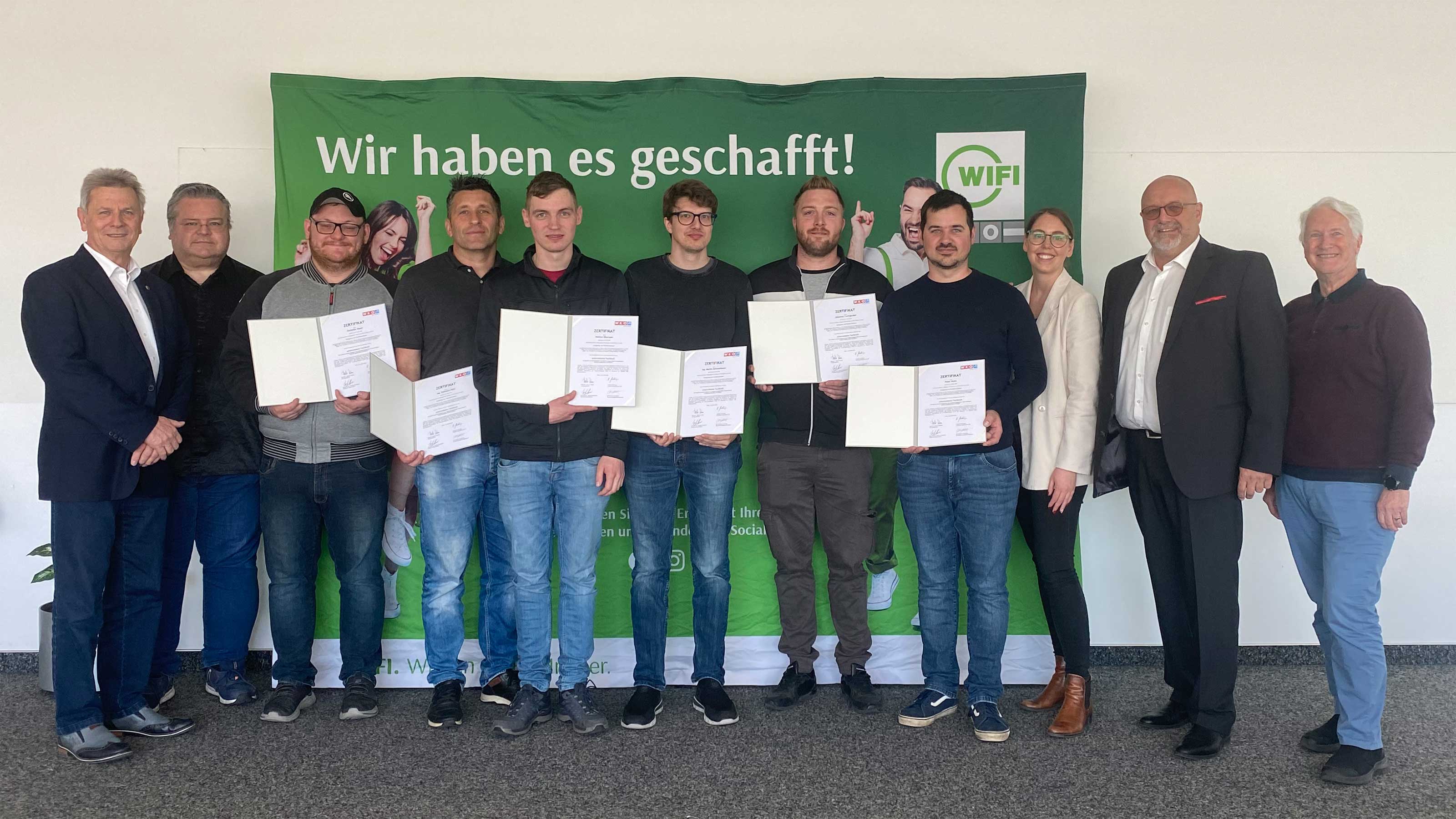 © WIFI OÖ v.l.n.r: LIM KommR August Stockinger, BIM TechnR DI Dr. Rainer Gagstädter, Christian Hauer, Ing. Vjekoslav Mijić, Hannes Oberauer, Ing. Martin Demmelbauer, Johannes Fuchsgruber, Peter Waha, Elisabeth Lettner MSc, BIM KommR Ing. Andreas Kandioler, KommR Johann Fiedler