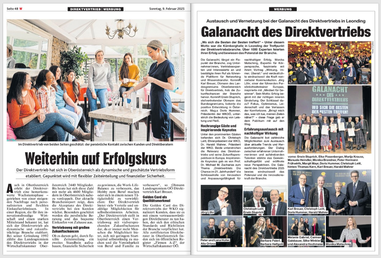 KommR Karl Breuer, Obmann des Landesgremiums Oberösterreich des Direktvertriebs, betonte in seiner Eröffnungsrede die Zukunftsfähigkeit des Direktvertriebs. KommR Erwin Stuprich, Obmann-Stellvertreter des Bundesgremiums, hob die erfolgreiche Entwicklung der Branche in Österreich hervor. Mag.a Doris Hummer, Präsidentin der Wirtschaftskammer Oberösterreich, bekräftigte die Unterstützung der WKOÖ mit den Worten: „Leistung und Fleiß müssen sich lohnen.“