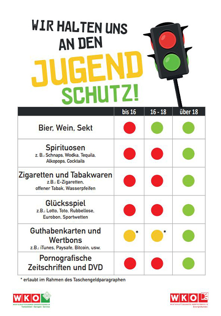 Gerne möchten wir Ihnen einen Arbeitsbehelf an die Hand geben, mit dem Sie auf einen Blick erkennen können, welche Produkte ab welchem Alter gekauft werden dürfen. Diese "Jugendschutzampel" kann sowohl als Unterstützung Ihres Kassenpersonals als auch als Kundeninformation verwendet werden. Durch den beidseitigen Druck und die Laminierung eignet sie sich auch zum Anbringen an Glasflächen, um von beiden Seiten eingesehen zu werden.