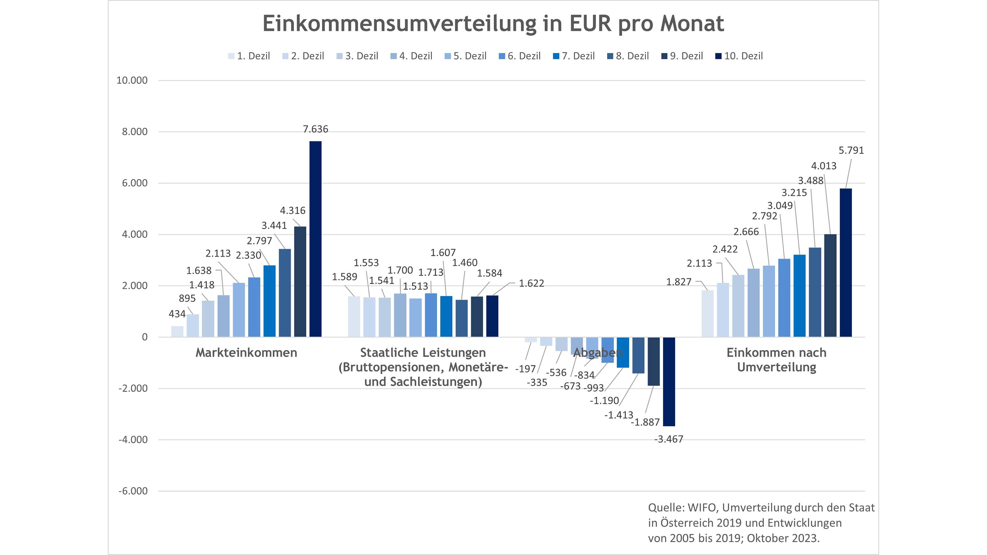 Auch die Sozialquote (Sozialausgaben in Prozent zum BIP) steigt seit 1955 stetig an: Im Jahr 1955 war Österreich noch bei 16,7%, im Jahr 1990 bei 26,1% und im Jahr 2022 bei 30,4%. Somit ist es nicht verwunderlich, dass mehr als zwei Drittel der Abgabenleistung in Österreich in Sozialtransfers fließt. Das Sozialsystem in Österreich ist dadurch über die Zeit zum „Versorgungssystem“ von großen Bevölkerungsteilen geworden. Das bestätigt auch die stetig steigende Anzahl der Personen, die gar keine direkten Steuerleistungen mehr für das Gemeinwohl erbringen (wie Lohn- und Einkommensteuer). Praktisch kommt es heute zu einer starken Umverteilung von den „oberen“ 20% zu allen anderen Personen, weil nur bei diesen zwei Dezilen das Markteinkommen höher ist als das Sekundäreinkommen bzw. das Einkommen nach der Umverteilung (WIFO, Umverteilung durch den Staat Österreich 2019).